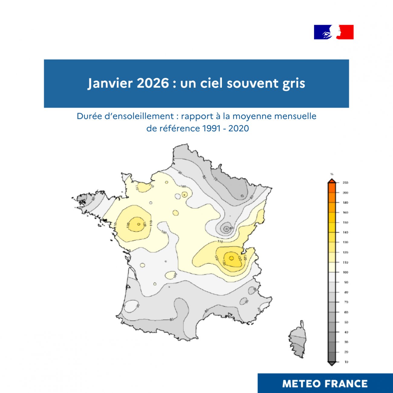 Conséquence du temps souvent perturbé, l’ensoleillement a été plutôt faible sur de nombreuses régions :