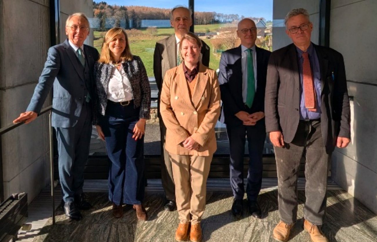 Claude Baland (à gauche) a cédé sa place à la présidence du conseil d’administration de l’Établissement public de coopération culturelle de Bibracte à François Philizot (au centre), en présence de Fabienne Decottignies, Préfète de la Nièvre, Émilie Acquistapace, sous-préfète de Château-Chinon (Nièvre), Jean-Philippe Constant, sous-préfet d’Autun (Saône-et-Loire) et Vincent Guichard, directeur général de Bibracte. (Photo : Bibracte)