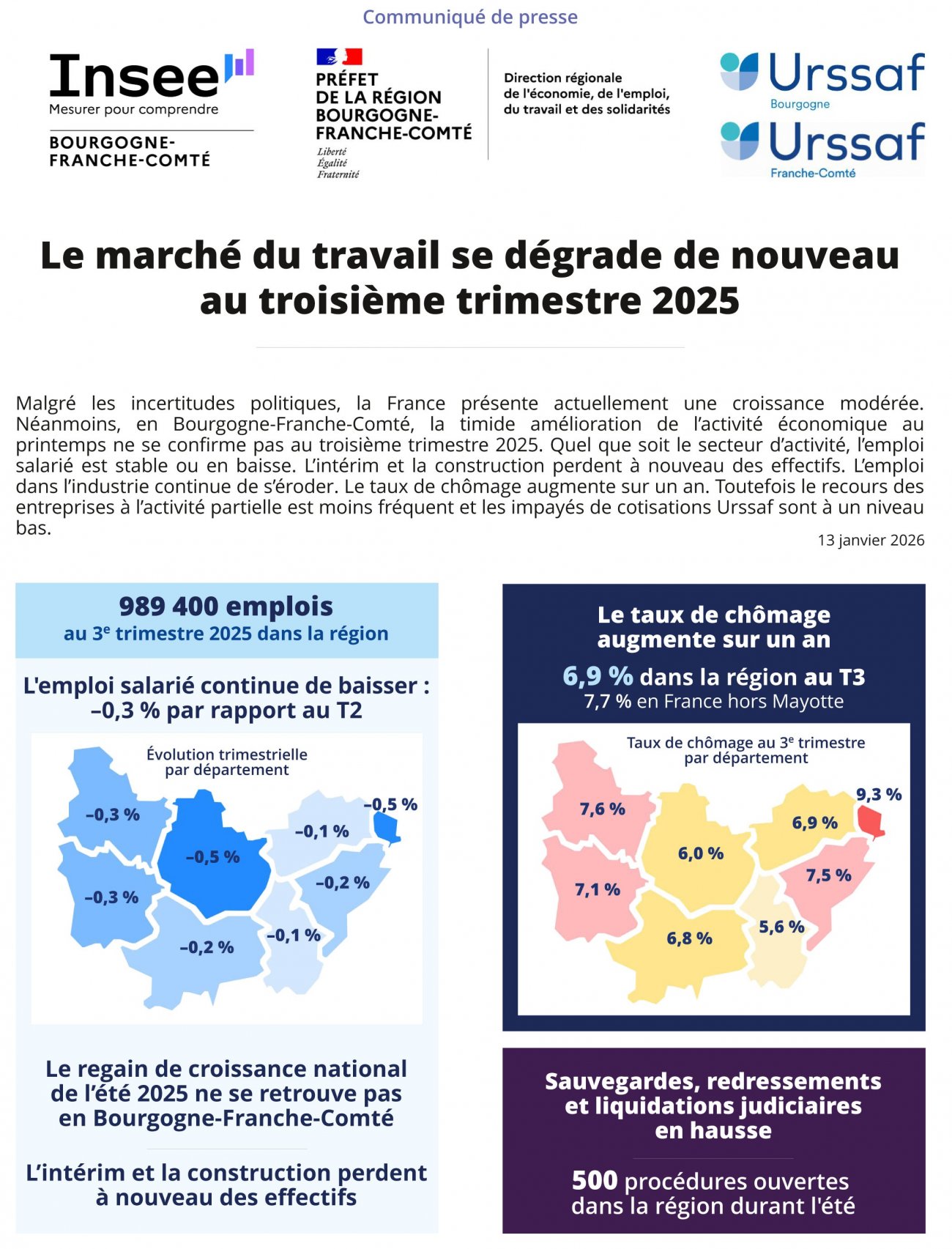 Plus localement, la moitié des zones d’emploi de la région ont un taux de chômage en hausse sur un an, et les autres sont stables. La zone d’emploi de Montbéliard enregistre la plus forte progression annuelle (+1,0 point). Elle a également le taux de chômage le plus élevé de la région (11,3 %). À l’inverse, la zone d’emploi de Beaune demeure la moins exposée de la région avec un taux de chômage de 4,3 %, stable sur un an.
