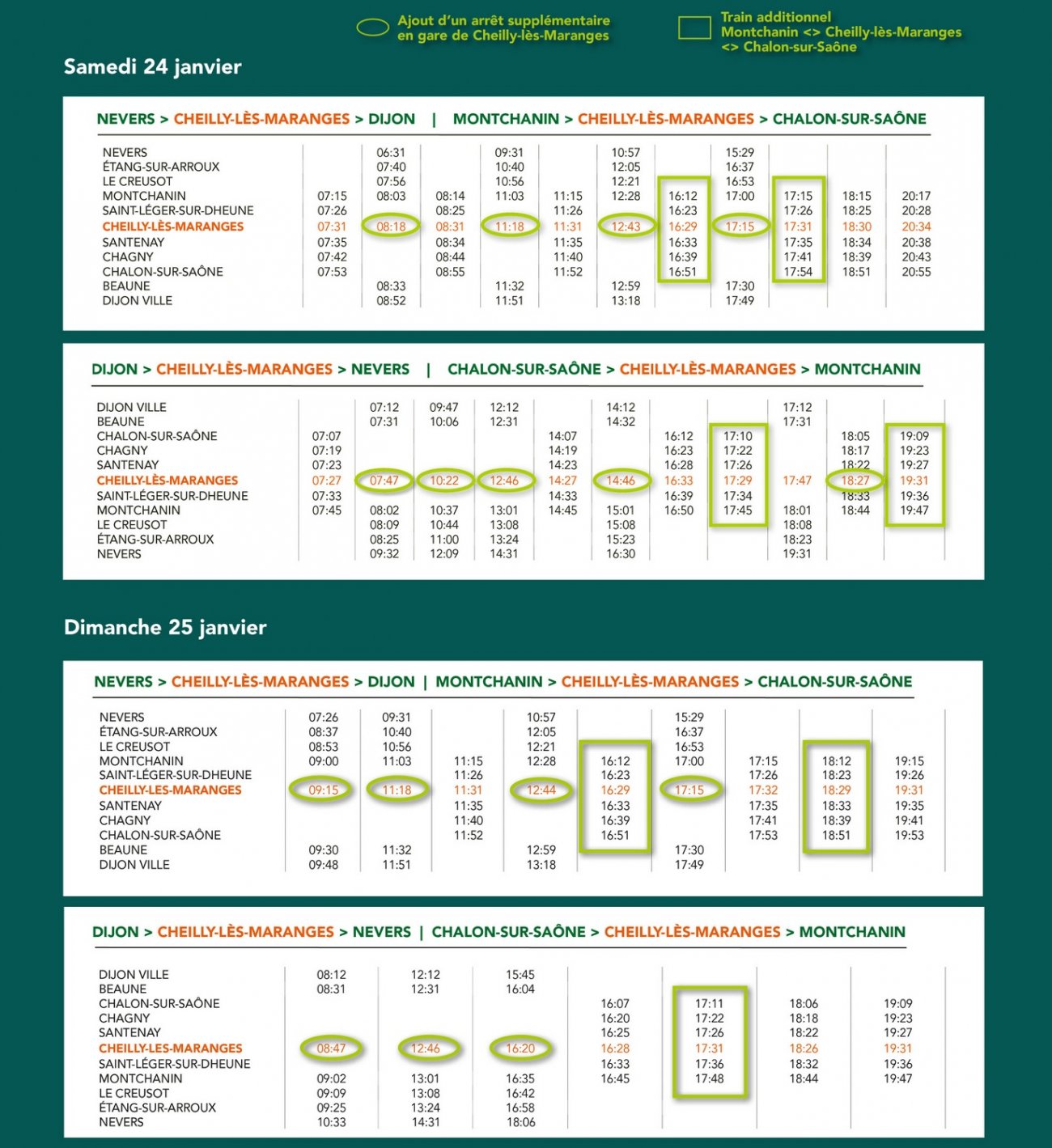 - Mise en place d’arrêts supplémentaires en gare de Cheilly-lès-Maranges pour tous les TRAINS Mobigo de la ligne Dijon – Nevers,