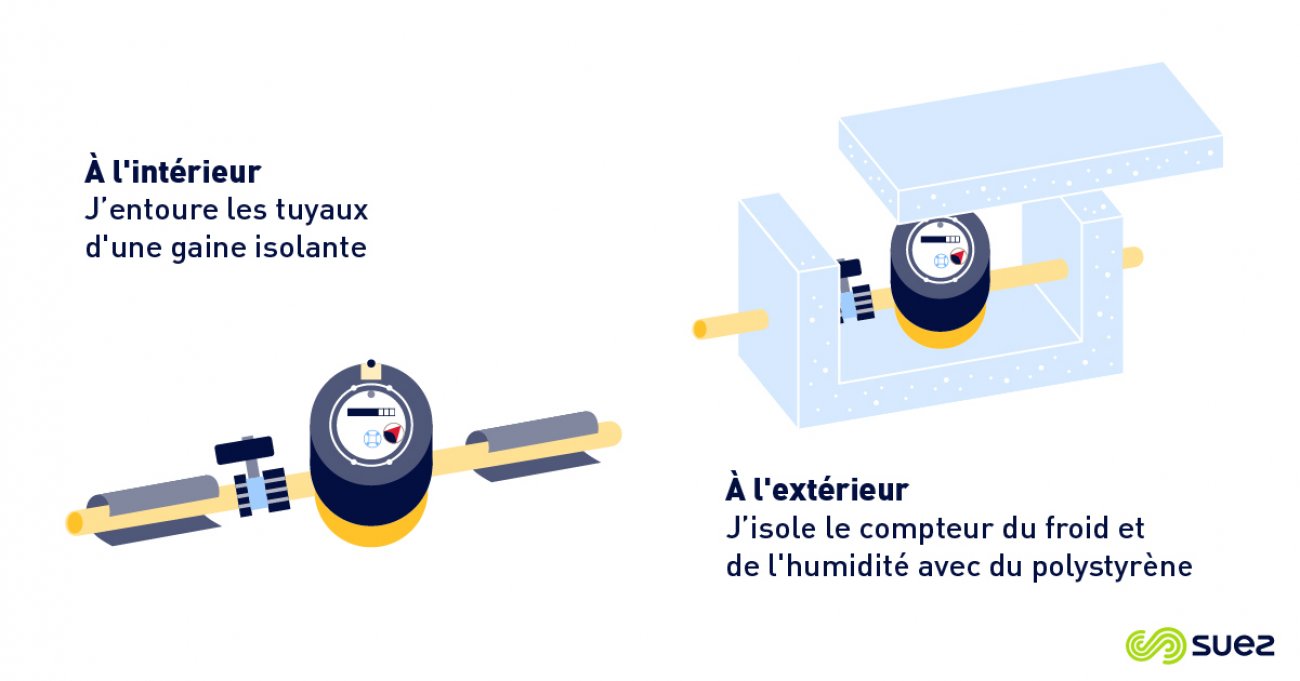 Pour éviter des désagréments (casse de canalisations, fuites, coupures d’eau...), SUEZ recommande de vérifier et de protéger son compteur en le calfeutrant avec des plaques de polystyrène. Des protections adaptées sont également vendues dans les magasins de bricolage. Autre solution : remplir un sac avec des chips de polystyrène et le poser sur le compteur.