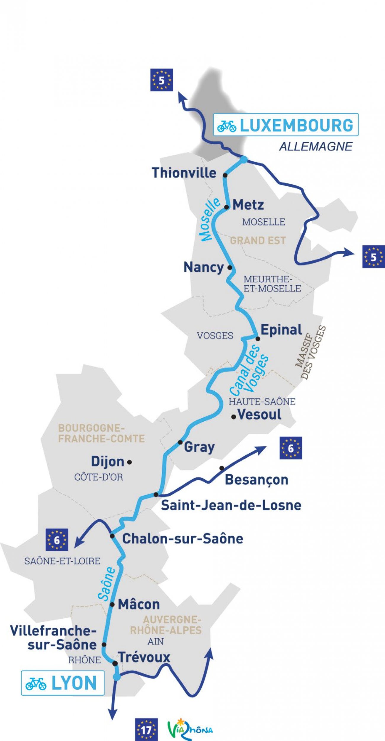 De la frontière luxembourgeoise (Apach) à Lyon, La Voie Bleue® est un itinéraire de près de 700 km qui serpente au fil de l’eau. Concentré du patrimoine français, alternée de villes animées, elle est jalonnée de cours d’eau, de villages de caractère, de châteaux, de vignobles, de musées et de vues à couper le souffle, le tout en longeant la Moselle, les chemins de halage du Canal des Vosges et les bords de Saône jusqu’à sa confluence avec le Rhône.