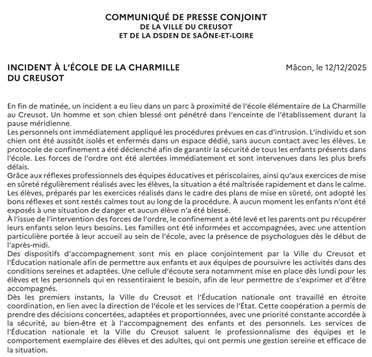 Dès les premiers instants, la Ville du Creusot et l'Éducation nationale ont travaillé en étroite coordination, en lien avec la direction de l'école et les services de l'État. Cette coopération a permis de prendre des décisions concertées, adaptées et proportionnées, avec une priorité constante accordée à la sécurité, au bien-être et à l'accompagnement des enfants et des personnels. Les services de l'Éducation nationale et la Ville du Creusot saluent le professionnalisme des équipes et le comportement exemplaire des élèves et des adultes, qui ont permis une gestion sereine et efficace de la situation.