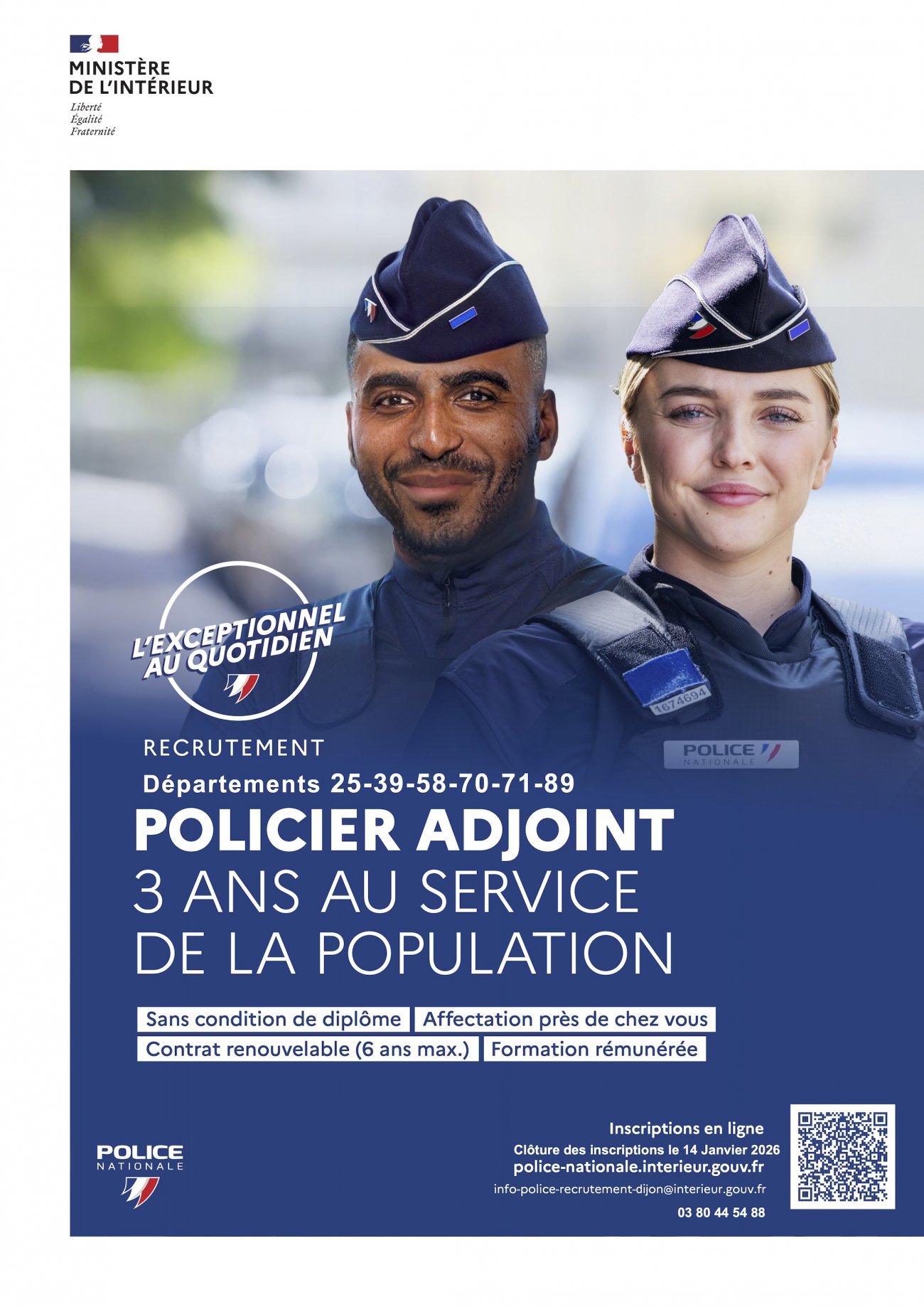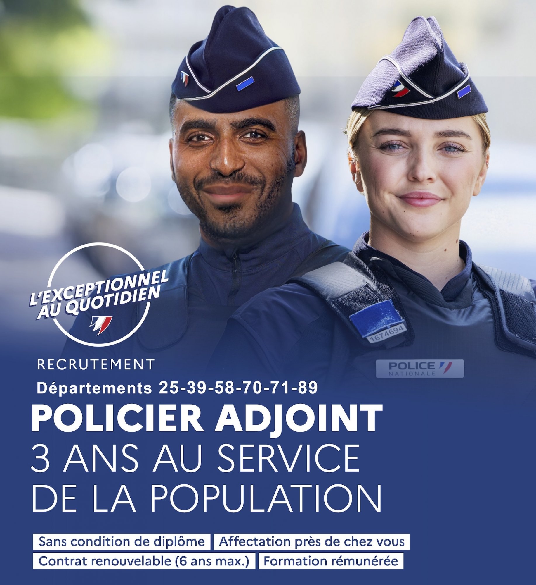 Conditions de recrutement : Recrutement sans condition de diplôme à partir de 18 ans et jusqu’à 30 ans, devenez policier adjoint dans votre département ou dans la région de votre choix.