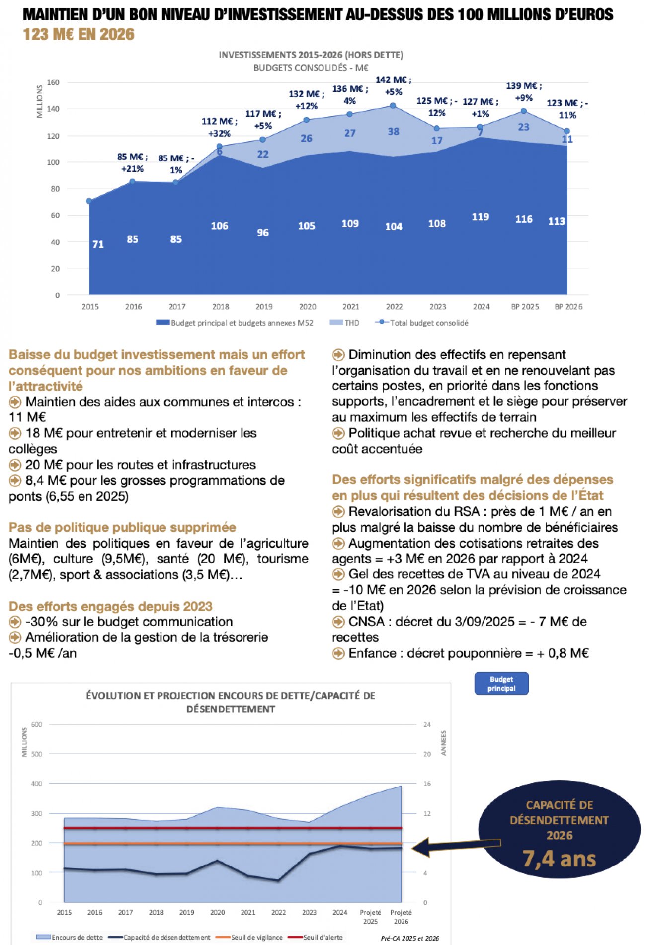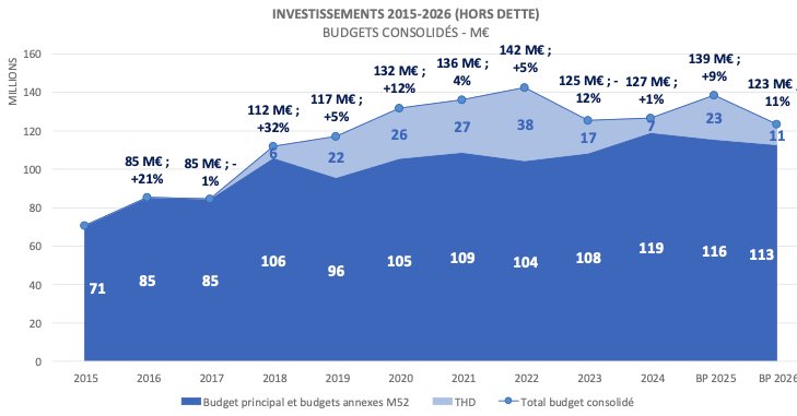 Nous maintenons une politique d’investissement soutenue, au-dessus des 100 millions d’euros : 138 M€ en 2025, 123M€ en 2026 (budget principal THD compris).