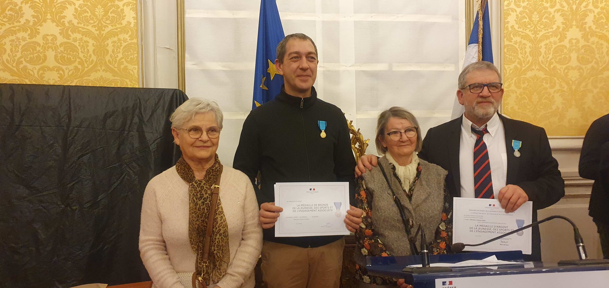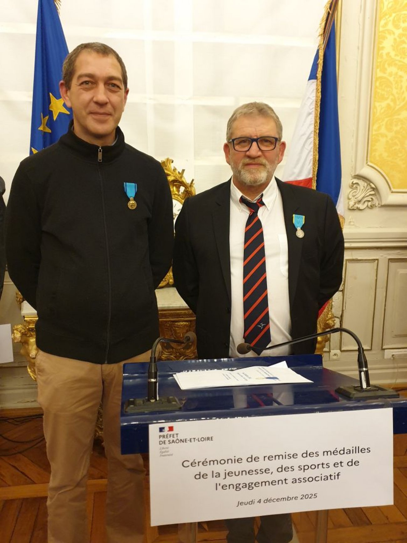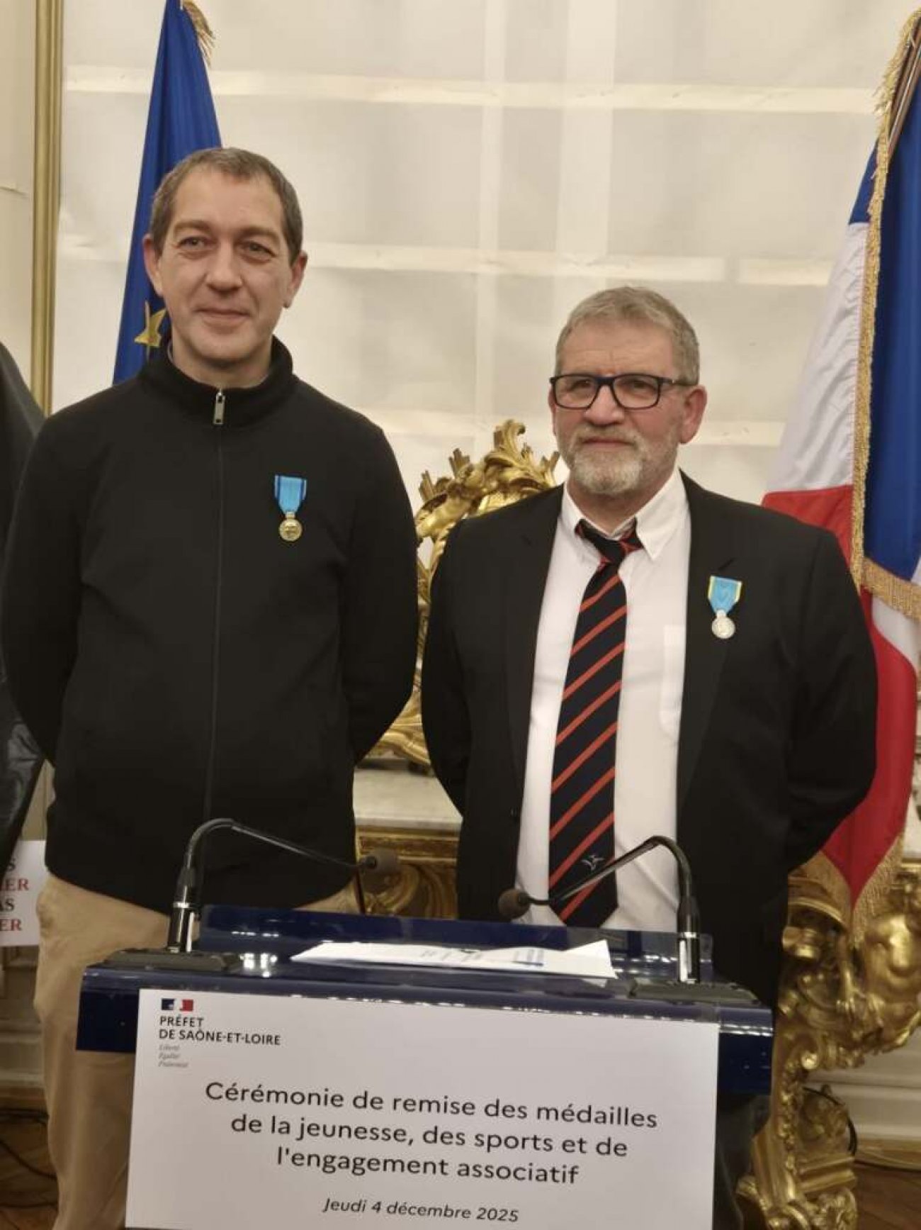 C’est le Préfet Dominique Dufour ainsi que Catherine Pierre inspectrice d’académie et leurs proches collaborateurs qui se sont partagé de la remise des médailles à l’ensemble des récipiendaires, Serge Cognard le Président du CD MJEA 71 c’est chargé de la remise des diplômes , dans l’assistance étaient également présents Michel Dumerger ,Guy Arnoud, Gérard Tollard ,Maurice Chazeau ( élu à Digoin )ce dernier a reçu la médaille d’Or, et bien d’autres personnalités impliquées tous membres CD MJSEA 71 ,  était également présent le Président du CDOS  Bernard Ponceblanc ( Chevalier de la Légion d’Honneur ), M. le Maire de Chagny et bien d’autres personnalité .