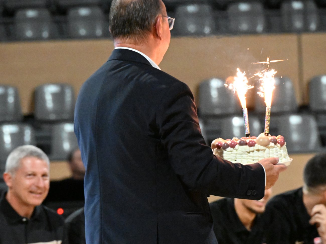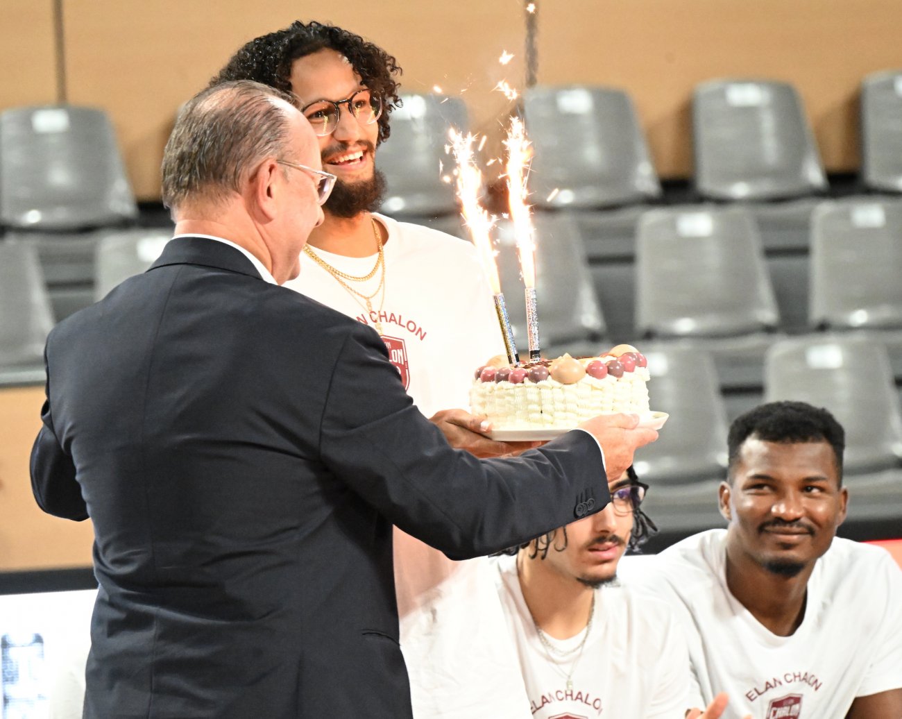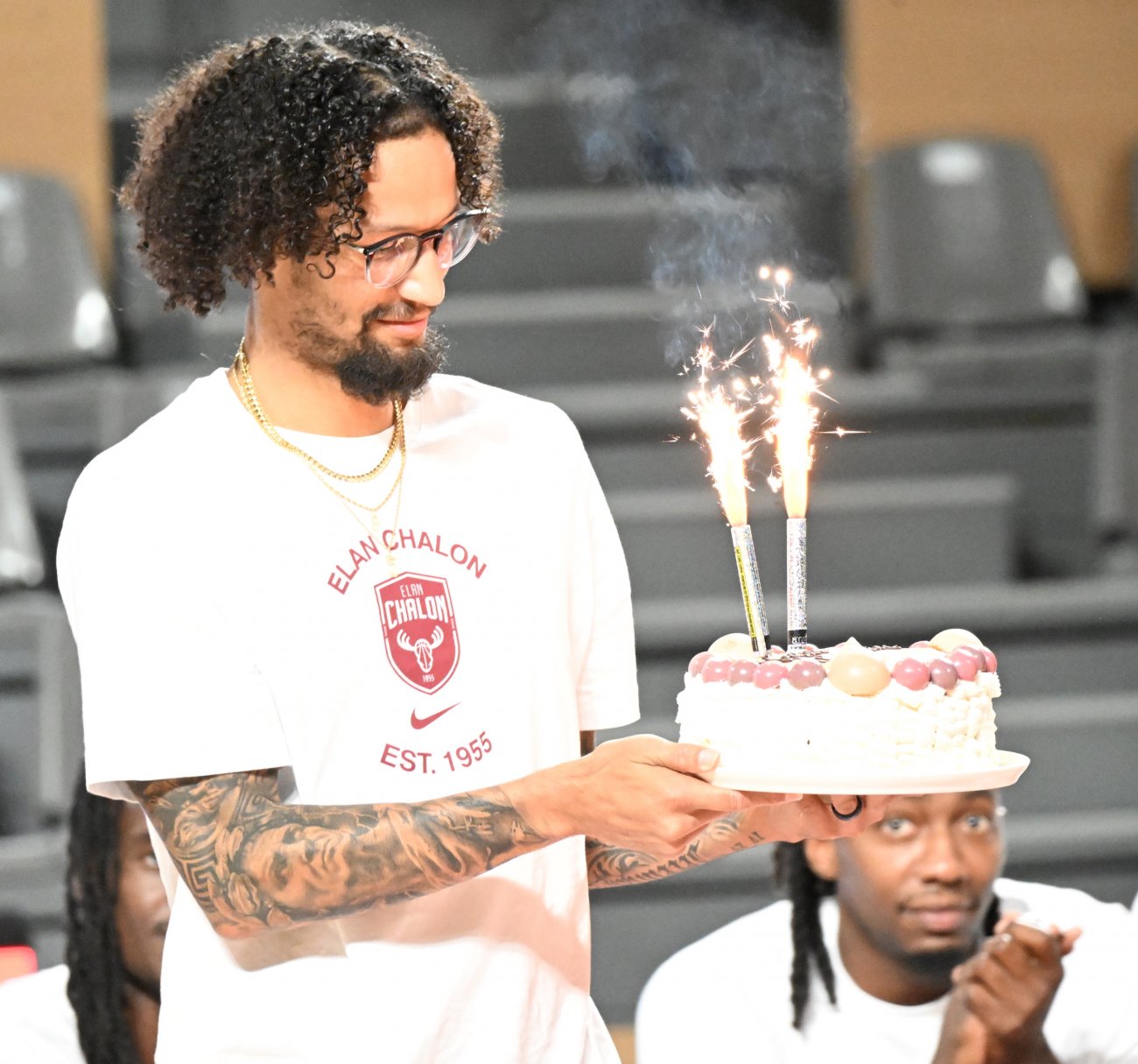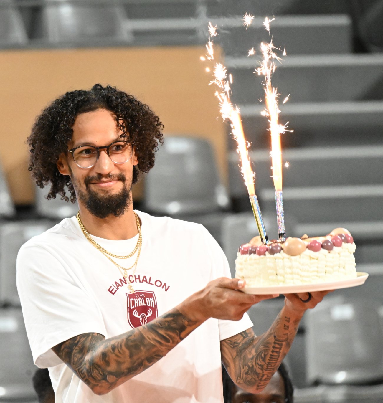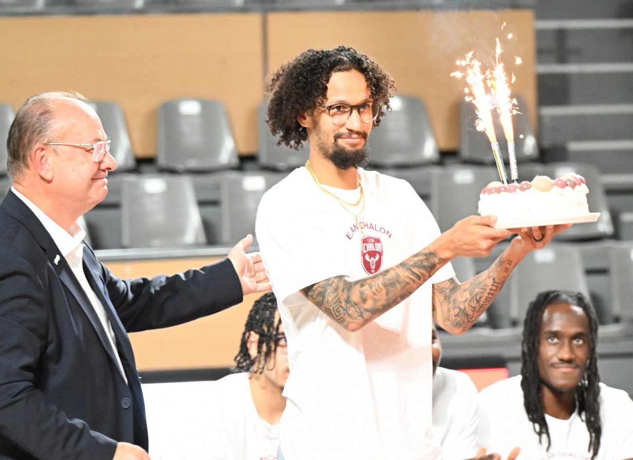 On n’a pas tous les jours 30 ans ! Et comme l’Elan Chalon est une grand famille, c’est Vincent Bergeret en personne qui a apporté à Jeremiah Hill un magnifique gâteau d’anniversaire. C’était jeudi soir au Colisée, où l’Elan Chalon présentait officiellement son équipe à ses partenaires. Avec pour cerise sur le gâteau… les 30 ans de Jeremiah qui était évidemment tout sourire.