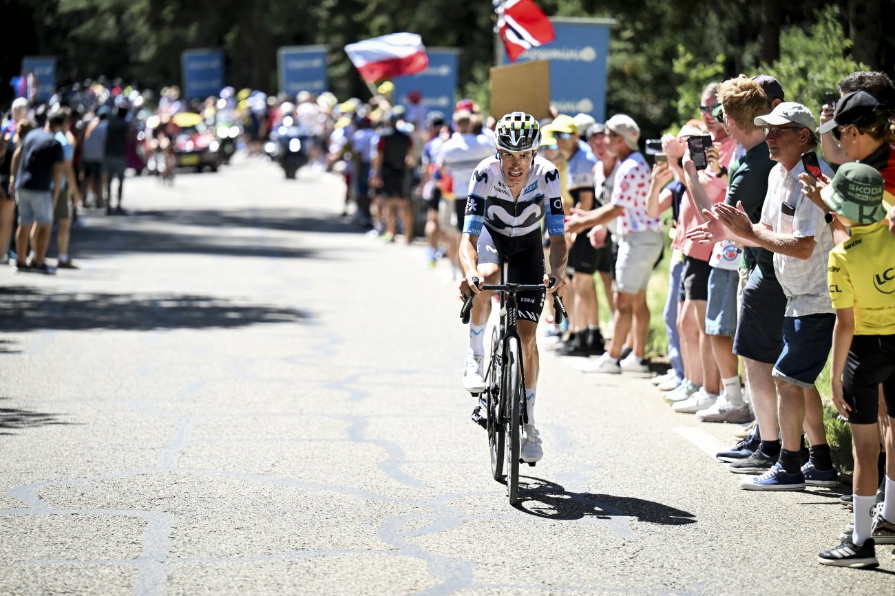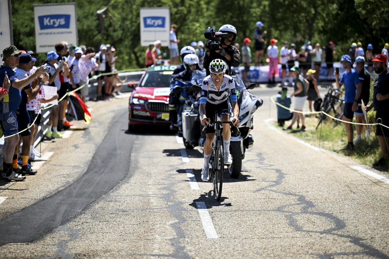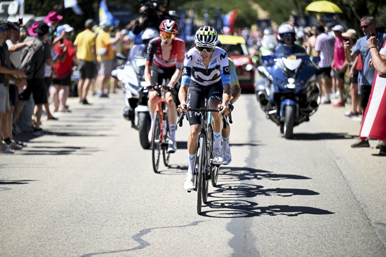 Mais un peu plus loin, à 14 km de l’arrivée, l’offensive d’Enric Mas le propulse à l’avant, avec le duo Alaphilippe-Arensman à ses trousses. L’Espagnol tient le choc un moment, mais voit revenir sur lui V.Paret-Peintre et Ben Healy à 3,5 km. L’affaire semble se jouer entre les trois hommes avec un léger désavantage pour Mas qui fait l’élastique.