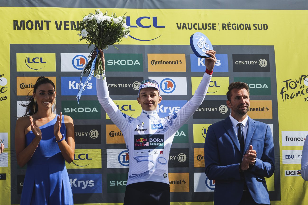 25 : LE VENTOUX DES JEUNESValentin Paret-Peintre, Ben Healy et Santiago Buitrago affichent une moyenne d'âge de 25 ans et 30 jours. Le podium d'étape le plus jeune du Tour 2025, mais aussi le plus jeune de l'histoire des arrivées au Mont Ventoux ! Le précédent record remontait à 1970 (26 ans et 20 jours pour Eddy Merckx, Martin Van den Bossche et Lucien Van Impe).
