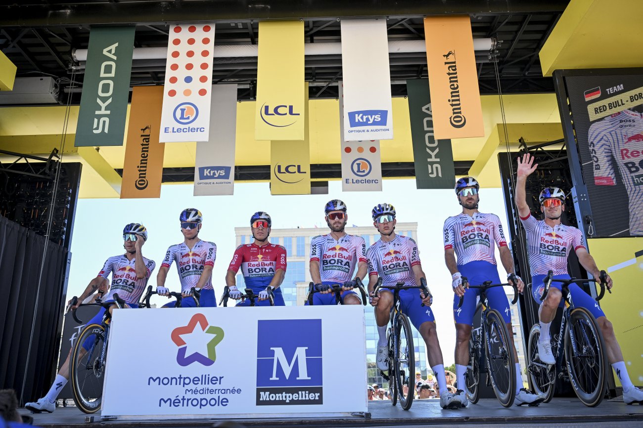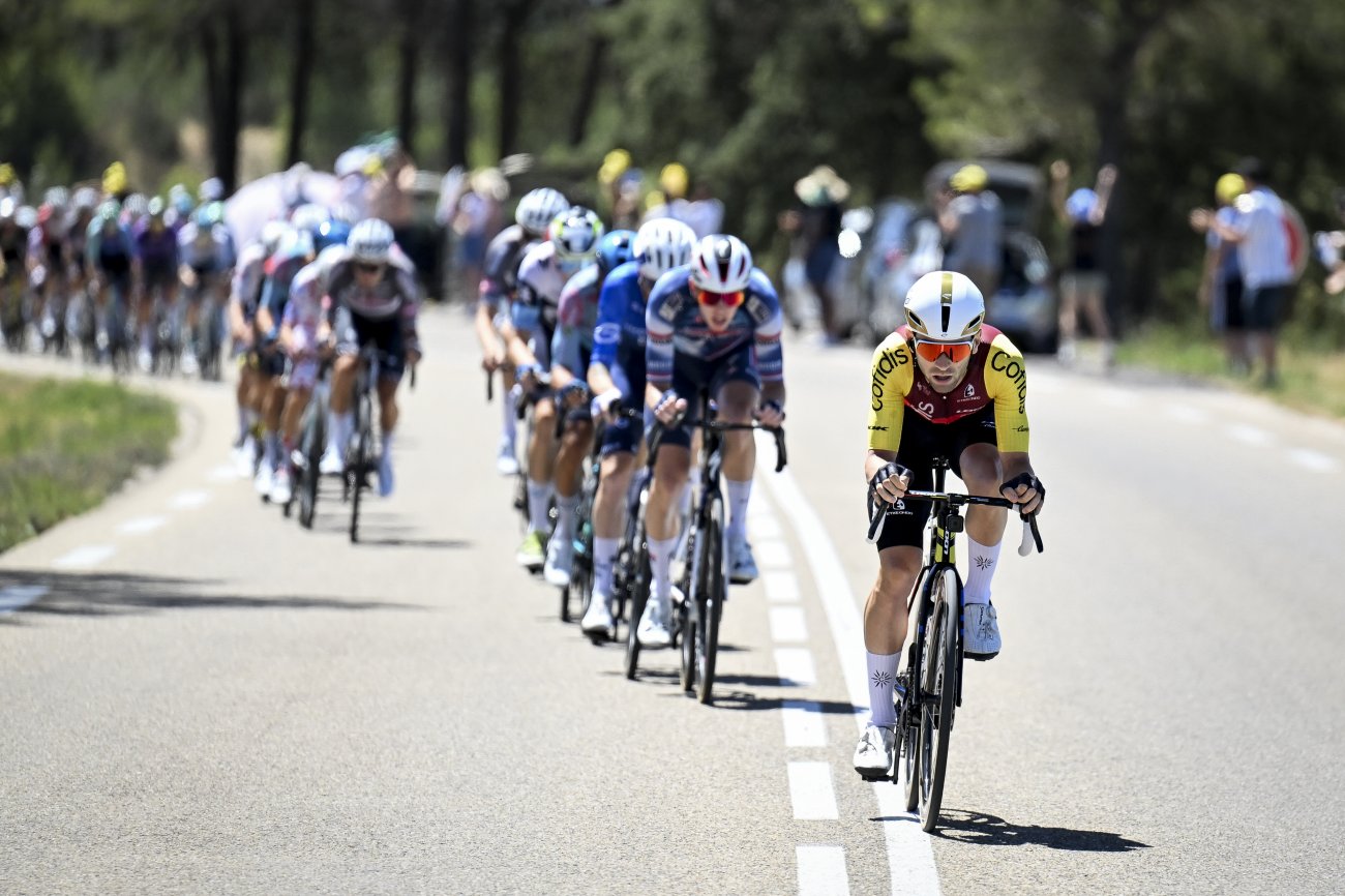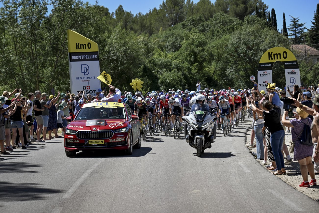 Après le forfait de Mathieu Van der Poel (Alpecin-Deceuninck), 165 coureurs sont réunis au départ de Montpellier. La bataille est d’emblée intense pour prendre l’échappée, lancée au km zéro par Wout van Aert. C’est au kilomètre 11 qu’un trio composé de Marco Haller, Marc Hirschi (Tudor) et Xandro Meurisse (Alpecin-Deceuninck) se détache, puis obtient un avantage de 1’40’’.