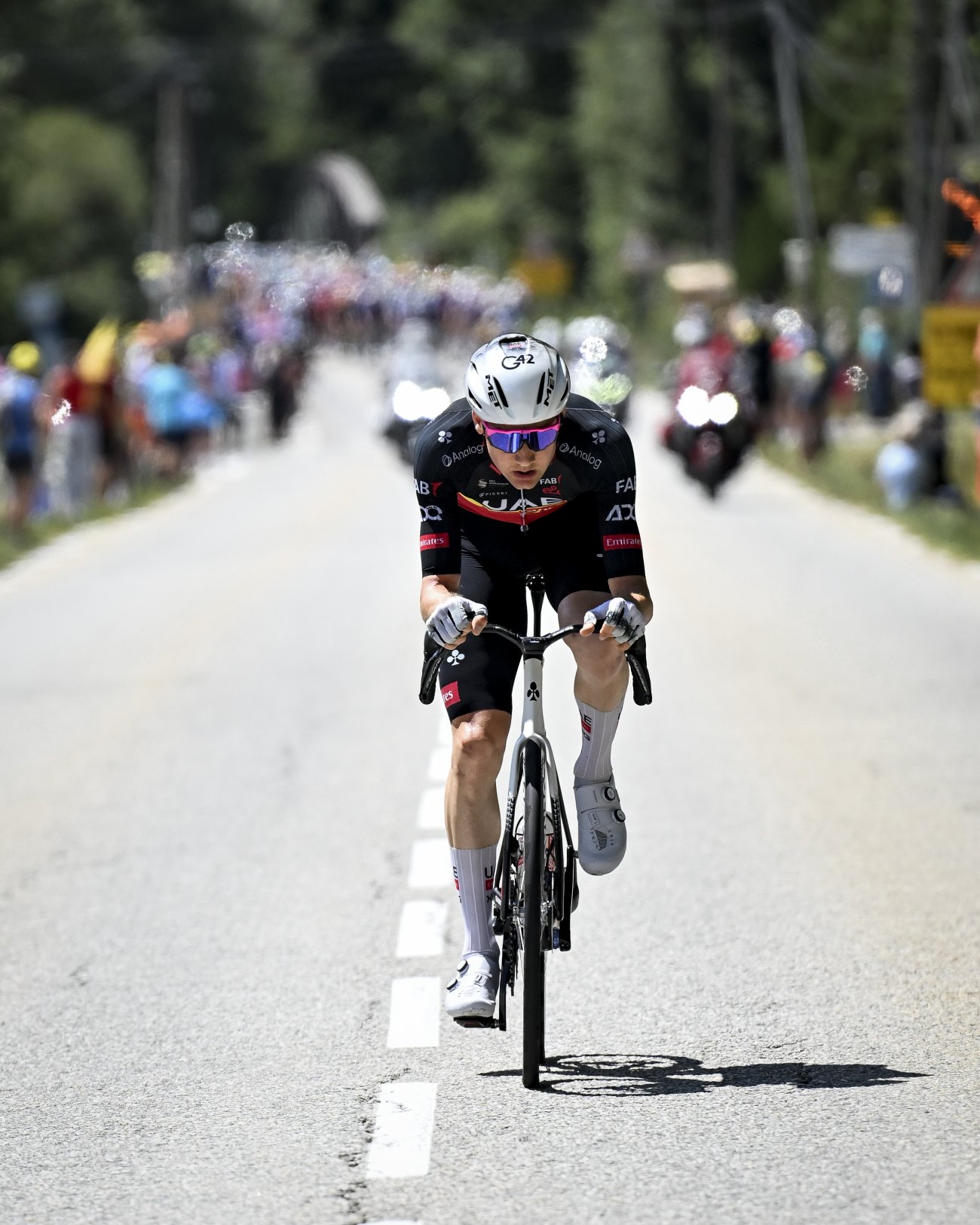 Le coureur de Jayco-Al-Ula ne fait ensuite que creuser son écart jusqu’à l’arrivée, où il triomphe pour la deuxième fois sur le Tour de France. Derrière le soliste australien, le groupe Maillot Jaune, qui a d’abord repris une composition de 19 coureurs, s’effiloche tout au long de l’ascension et perd notamment Florian Lipowitz.