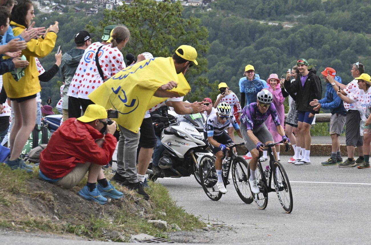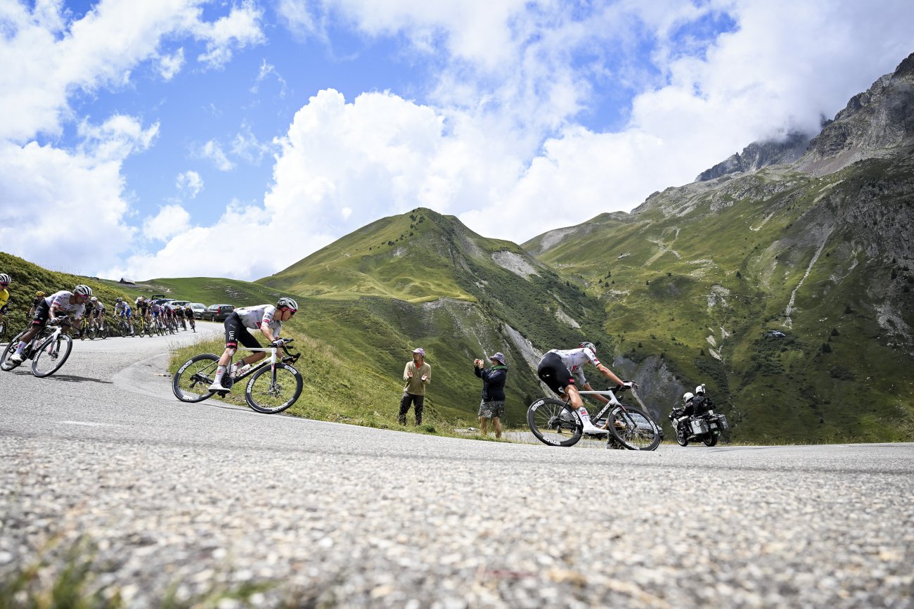 Dans la descente, le duo Jorgenson-Arensman prend les devants, mais la configuration est encore modifiée dans la montée au col de la Madeleine, pour laquelle le maillot à pois n’est plus dans le match. A 11 km du sommet, les deux descendeurs ont été repris et roulent en compagnie de Primoz Roglic (Red Bull-Bora-Hansgrohe), Ben O’Connor (Jayco AlUla), Einer Rubio (Movistar), Felix Gall, Bruno Armirail (Decathlon AG2R La Mondiale) et Alex Baudin (EF).