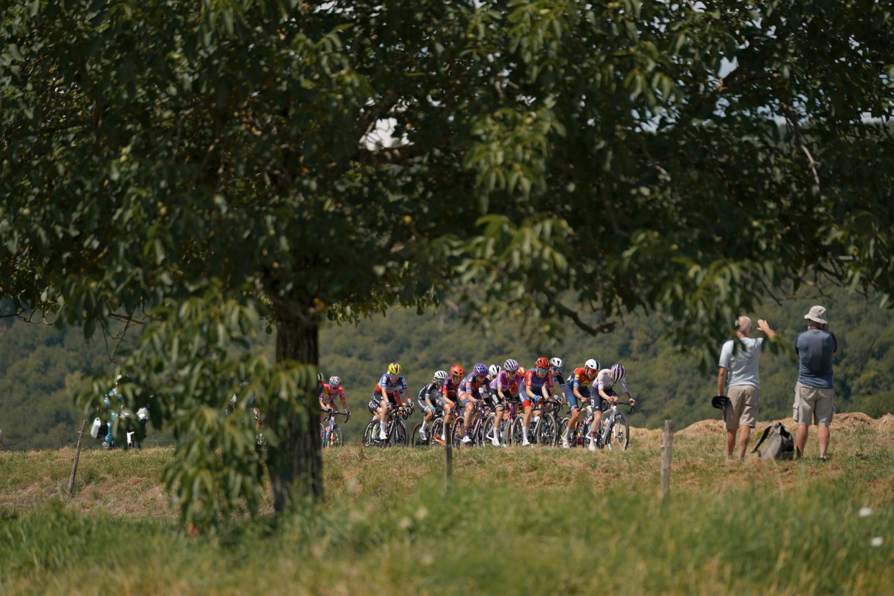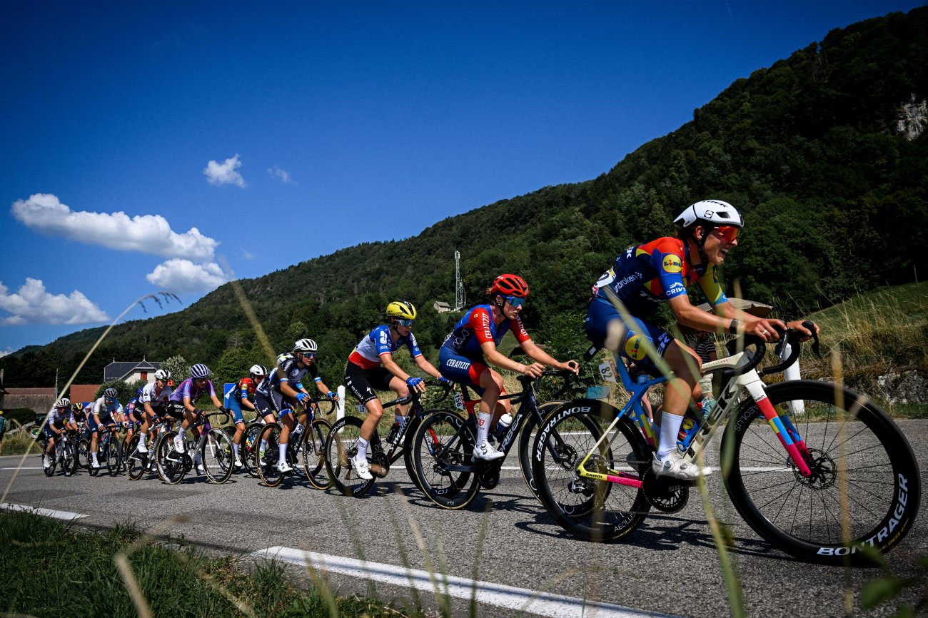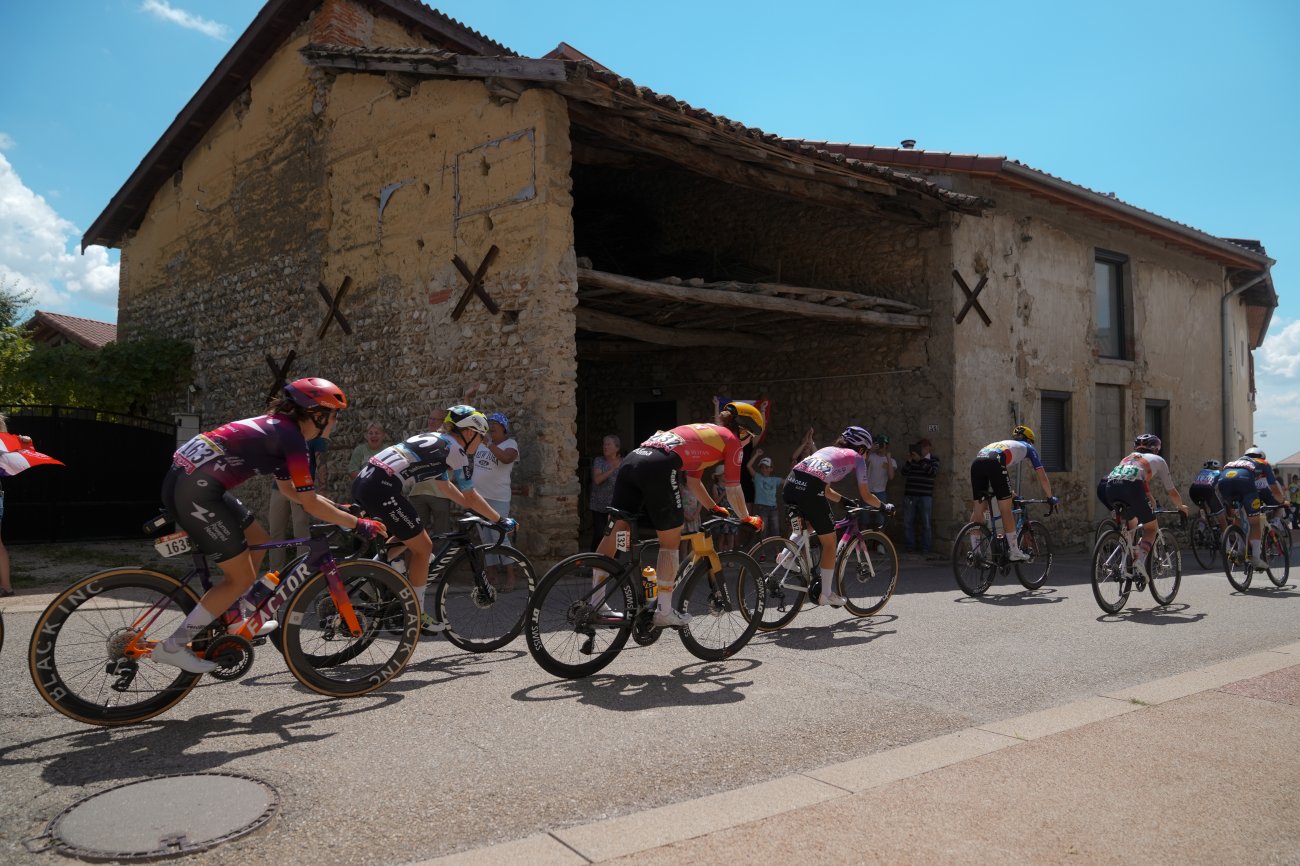 La formation Visma|Lease a Bike apporte sa contribution et le peloton se scinde momentanément en plusieurs morceaux. L'Irlandaise Mangan remporte le sprint intermédiaire de Groslée-Saint-Benoît (km 73,2). Elle fait partie des lâchées dans la première des trois ascensions du jour. Squiban passe en tête à la côte de Saint-Franc (2e catégorie). Au sommet, elles ne sont plus que neuf à l'avant. Le peloton, qui continue de perdre du temps, bascule avec un retard de 4'25".