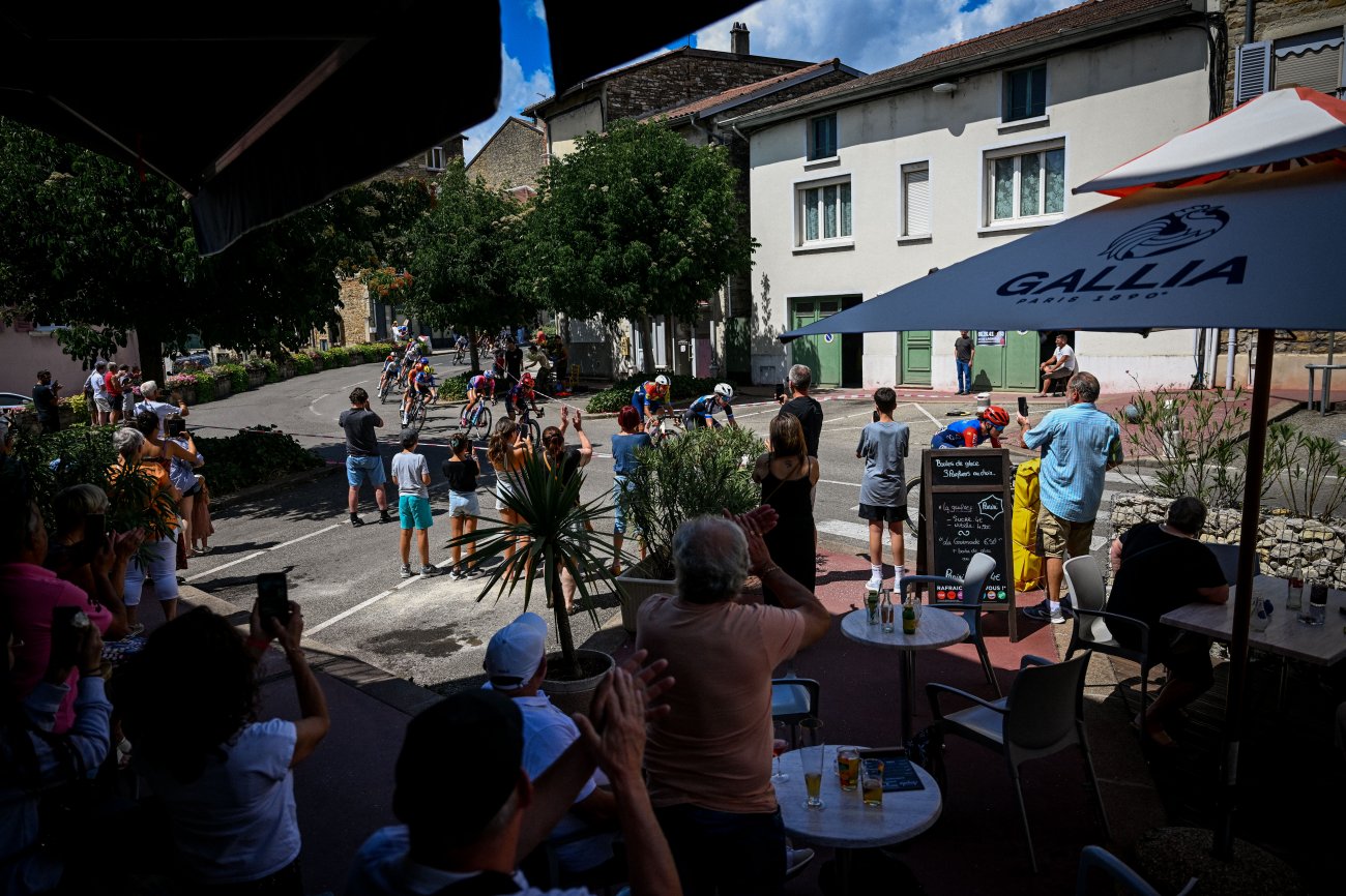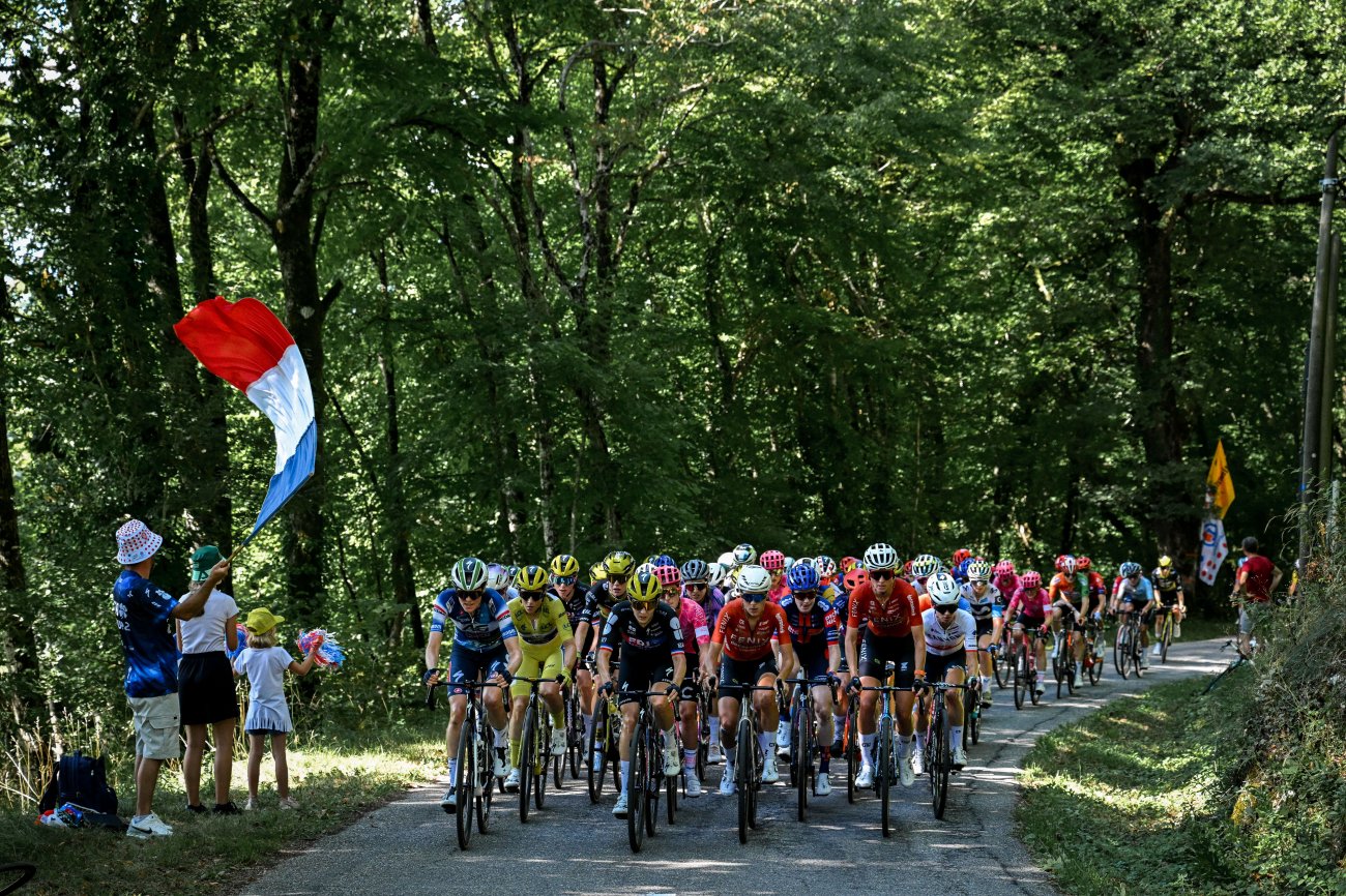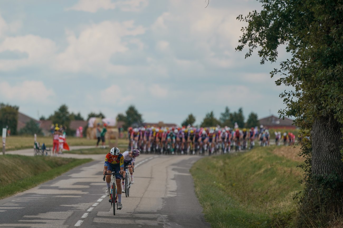 Toutes les coureuses arrivées la veille à Ambert prennent le départ de la 7e étape, donné à 13h37 de Bourg-en-Bresse. Sur son nuage au lendemain de sa première victoire sur le Tour, Maeva Squiban (UAE Team ADQ) est la première à s'échapper dans cette journée longue de 159,7 kilomètres en direction des Alpes et du massif de la Chartreuse. La Française est rejointe par Lucinda Brand (Lidl-Trek). Les deux femmes sont reprises. Avant de parvenir à se glisser dans une nouvelle échappée qui se forme au km 15 et totalise 17 coureuses. Ce groupe compte rapidement trois minutes d'avance.