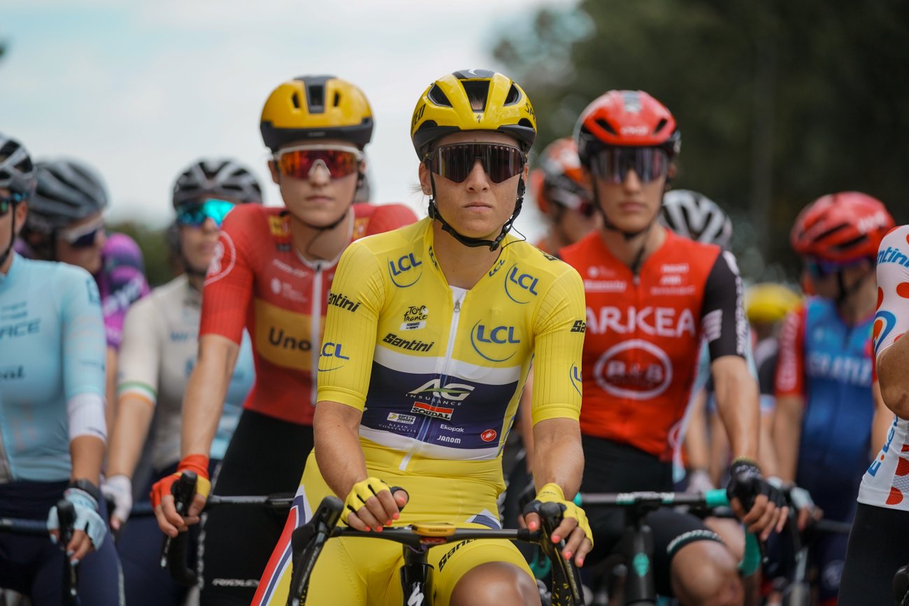 4 : LE JAUNE NE LA QUITTE PLUSKim Le Court Pienaar empoche un 4e Maillot Jaune cette semaine, conservé grâce à une excellente descente finale. Elle égale Katarzyna Niewiadoma et Demi Vollering au 3e rang des coureuses avec le plus de Maillots Jaunes. Devant elle : Lotte Kopecky (6) qu'elle peut rattraper en restant en tête jusqu'au bout, et Marianne Vos (8).