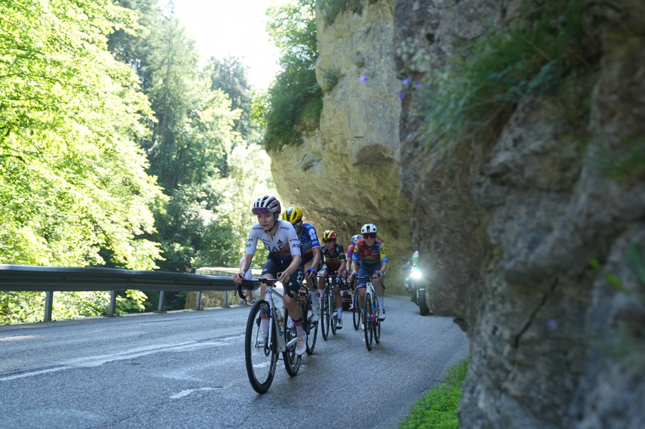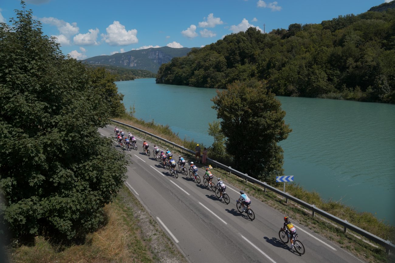 Dans une courte portion de transition, le groupe de tête temporise et retrouve de de l'épaisseur. Le groupe maillot jaune ralentit encore plus franchement et l'écart culmine à 5'15" à l'entame des 40 derniers kilomètres. Fenix-Deceuninck reprend les choses en main. Et le travail de Christina Schweinberger porte ses fruits. Au pied de la montée finale, en direction du col du Granier (2e catégorie, 8,9 km à 5,4%), le peloton n'a plus que 2'25" de retard sur un trio composé de Rijnbeek, Meijering et Edwards et 1'40" sur le groupe de contre.