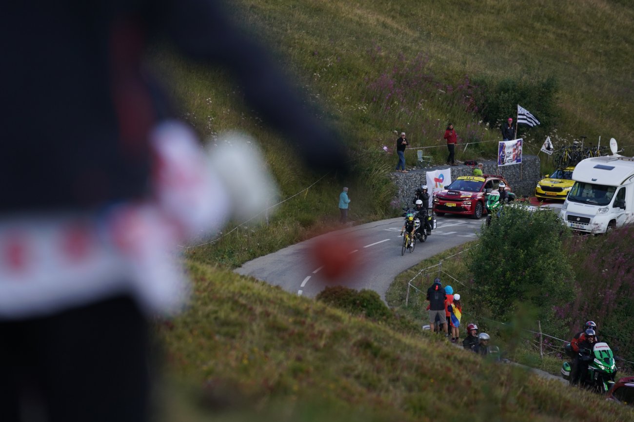 Une crevaison de Kasia Niewiadoma-Phinney, vainqueure sortante du Tour, retarde très légèrement le départ de la 8e étape, donné à 13h58 sur les pentes menant au col de Plainpalais (13,2 km à 6,3%). La formation FDJ-Suez se montre particulièrement active. Elle parvient à glisser deux éléments dans la bonne échappée.