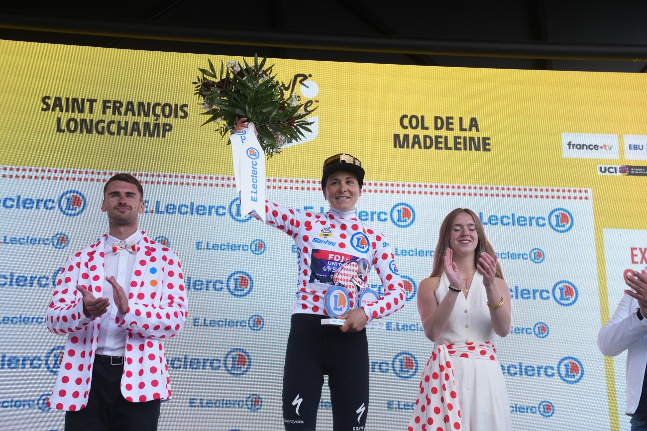 8 : CHABBEY PLUS EN POIS QUE JAMAISMaillot à pois depuis le premier jour, Elise Chabbey empoche sa 8e tunique de leader du classement de la montagne. Outre le fait que c'est un record, elle a désormais deux fois plus de maillots à pois que le deuxième plus grand total, les 4 de Femke Gerritse. Avec 16 points d'avance sur Maëva Squiban alors qu'il en reste 35 en jeu, la Suissesse est plus en tête que jamais. Elle est favorite à la succession de Justine Ghekiere.