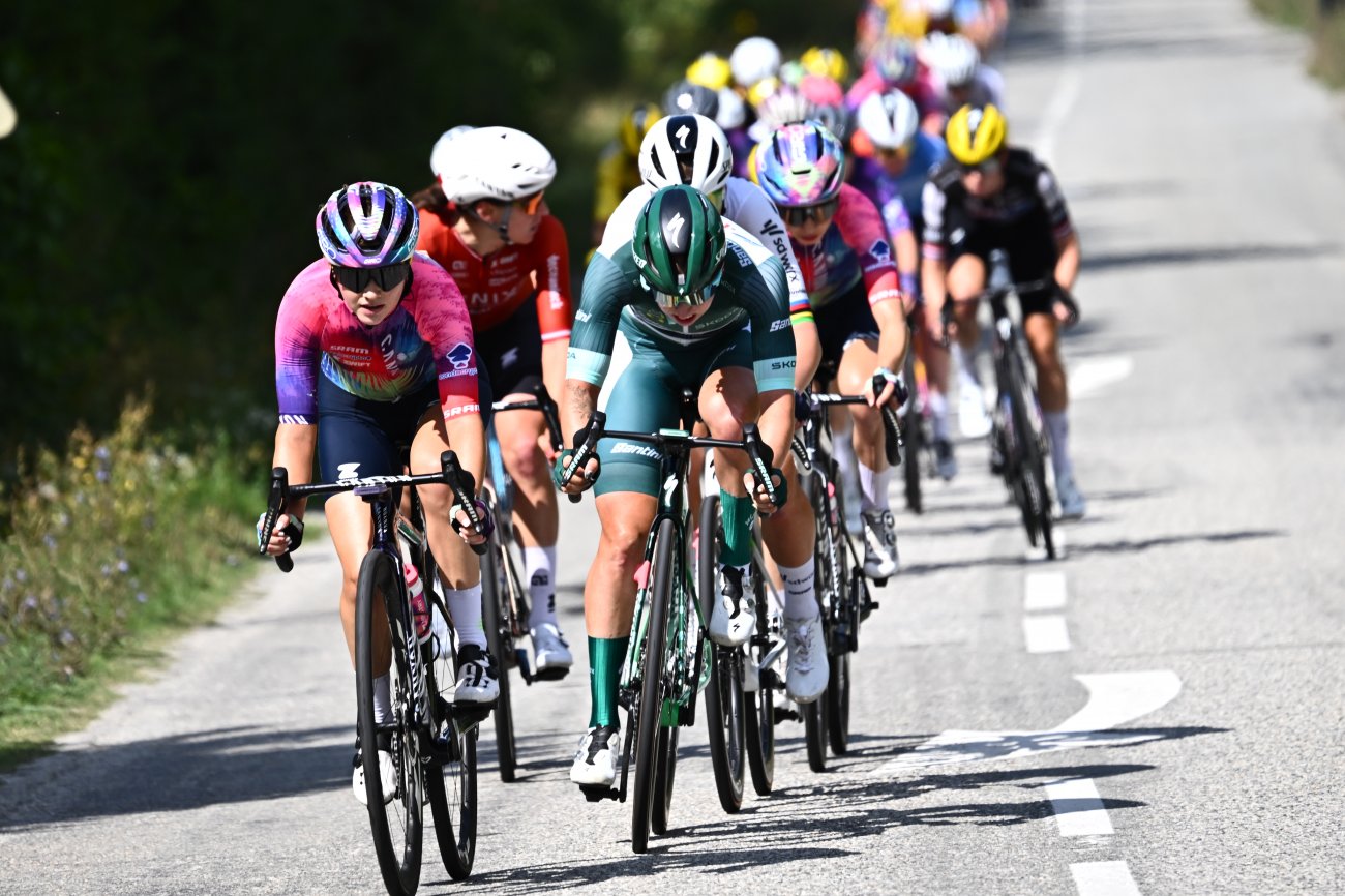 Les formations Canyon//SRAM zondacrypto et Visma|Lease a Bike finissent par réagir. Kim Le Court-Pienaar prend même les commandes du peloton à l'amorce de la descente du col du Frêne. Mais la Maillot Jaune tombe dans la première épingle, à 77 kilomètres de l'arrivée.