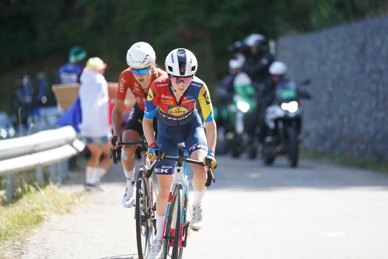 Squiban est rapidement distancée. Fisher-Black et Kastelijn s'isolent. Derrière, Le Court-Pienaar se mue en équipière pour préparer l'attaque de Gigante, qui intervient à 12 km du sommet. Pauliena Rooijakkers (Fenix-Deceuninck) est d'abord la seule à pouvoir la suivre.