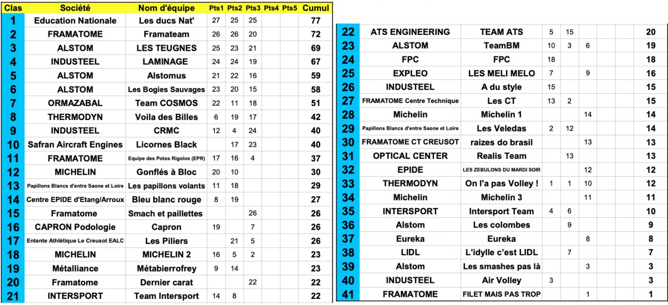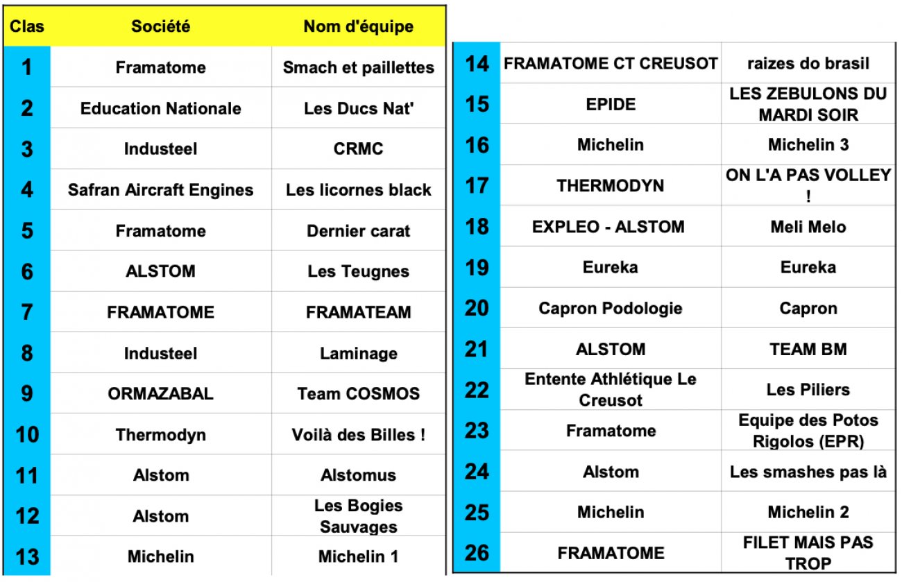 Sur le plan sportif, cette troisième étape fut une nouvelle fois de niveau relevé avec des points très disputés et des derbys interentreprises. A l’issue des trois phases de poule, l’équipe ‘Smash pas là (Framatome)’ remporte le tournoi. L’équipe ‘Educ Nat’ termine sur la deuxième marche. L’équipe CRMC (Industeel) complète le podium.