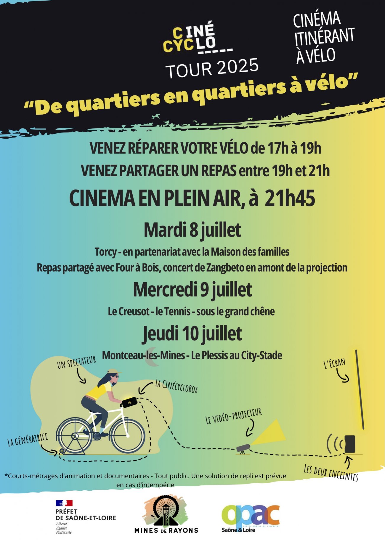 Projection en plein air avec CinéCyclo : À la tombée de la nuit, découvrez un film projeté grâce à l’énergie… de vos mollets ! Pédalez pour alimenter le projecteur et vivez une expérience unique !