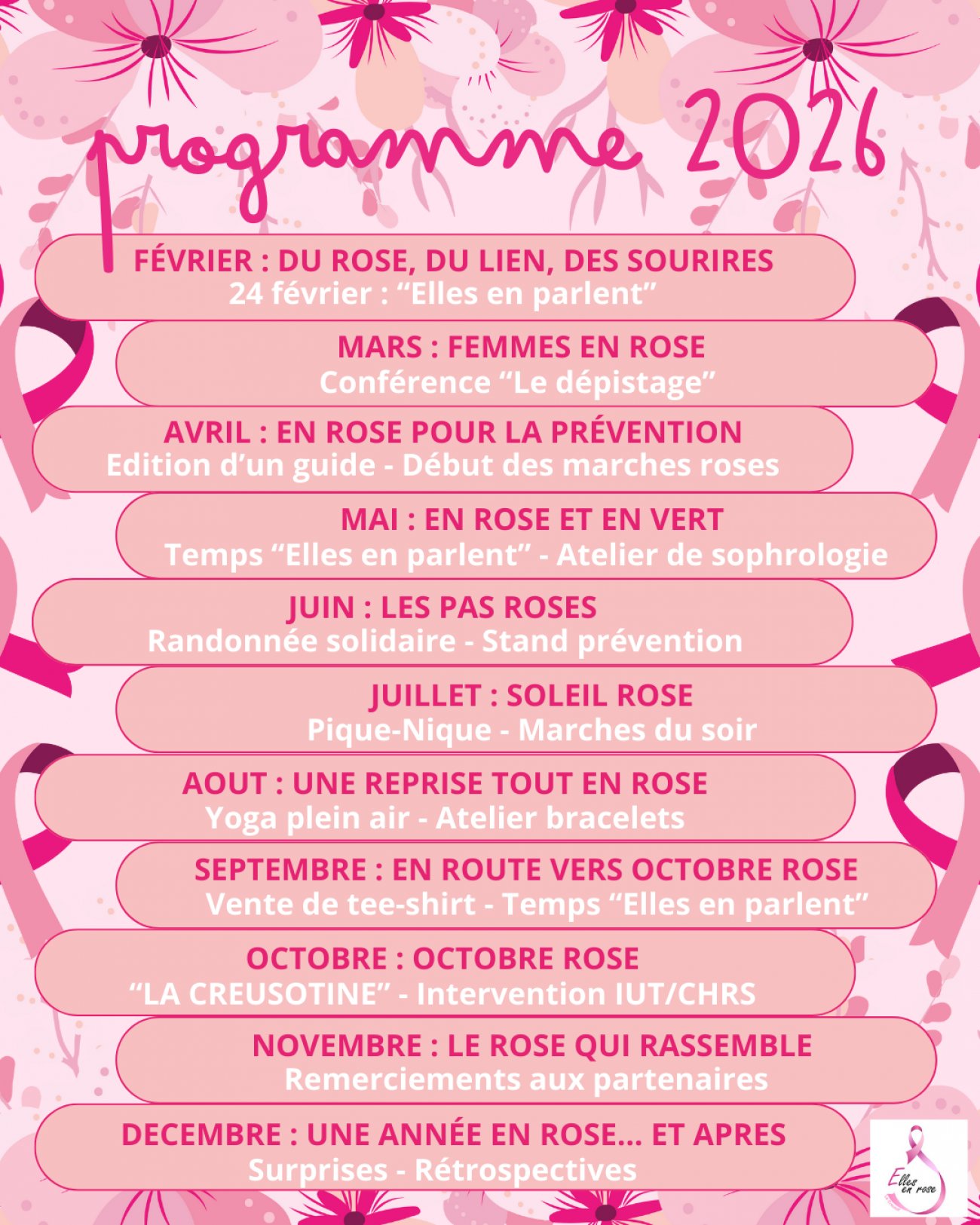 Les actions existantes seront bien entendu reconduites et améliorées avec de nombreux et nouveaux projets. Conférence, vente de tee-shirts, Octobre Rose, temps « Elles en parlent », sophrologie, yoga, activités manuelles, interventions de prévention, randonnées et une date à retenir dès à présent, « Les sentiers roses » le 07 juin avec 3 circuits de marche au départ de La Chaume.