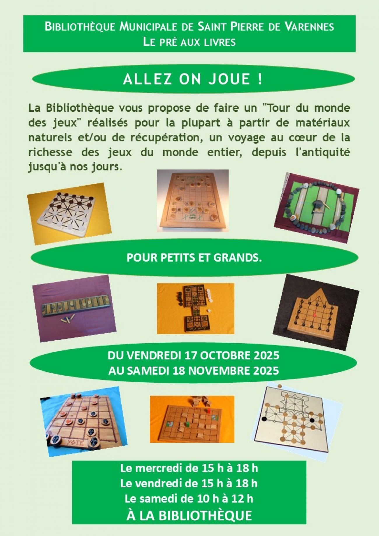 La bibliothèque vous propose ainsi de faire un "Tour du monde des jeux" réalisés pour la plupart à partir de matériaux naturels et/ou de récupération, un voyage au cœur de la richesse des jeux du monde entier, depuis l'antiquité jusqu'à nos jours. Les dates de cet événement sont arrêtées. Il s’agira de se rendre à la bibliothèque du vendredi 17 octobre 2025 au samedi 18 novembre 2025. Les horaires sont calés : Mercredi de 15 à 18 heures. Vendredi de 15 à 18 heures et samedi de 10 à 12 heures.