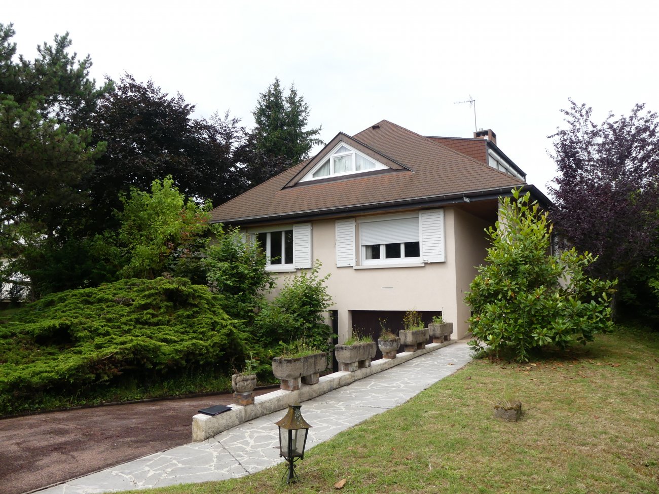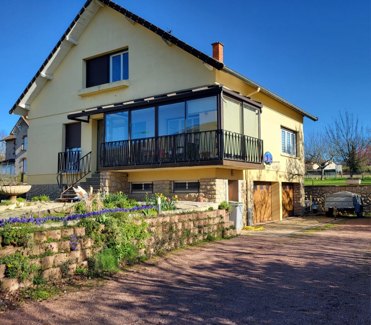 Le Creusot - Limite Le Breuil, dans un quartier au calme, Belle maison de ville en EXCELLENT ETAT GENERAL indépendante, élevée sur sous-sol et composée en rez de chaussée surélevé d'une entrée par petite véranda chauffée, dégagement avec placards, pièce de vie avec cuisine ouverte sur séjour/salon, cheminée, salle d'eau, WC, deux chambres, seconde et belle véranda de 18m² chauffée donnant accès sur jardin. Etage de deux chambres, salle d'eau avec WC. Sous-sol d'un garage avec porte motorisée, cuisine d'été, coin buanderie, chaufferie. Dépendances sur cour à usage de rangement. Le tout sur un agréable terrain clos de près de 700m².