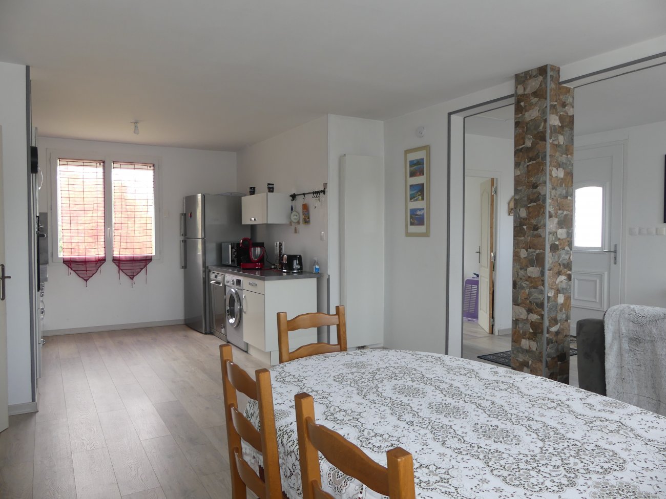 d'un 1er appartement occupé, d'une valeur locative de 550 €/mois avec garage, comprenant, de plain-pied, une entrée par pièce de vie avec cuisine équipée, buanderie, WC avec lave mains ; à l'étage, une pièce palière (bureau), salon avec accès à belle terrasse, deux chambres, salle de bain, WC.