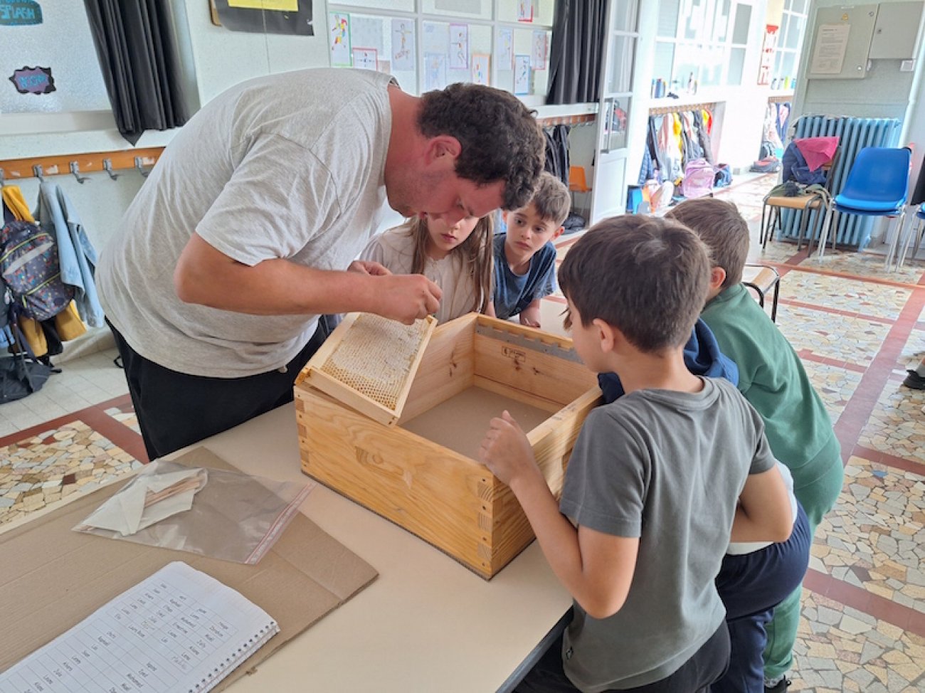 Ce mardi après-midi, les élèves de CE1 de l’école élémentaire du Breuil ont découvert l’apiculture et le fonctionnement d’une ruche. Le rôle et la vie des abeilles, leur cycle de vie, leur habitat, la reine, comment fait-on le miel, combien de kilos de miel sont récoltés par ruche, comment récupère t-on le miel sans être piqué, c’est quoi le pollen, la gelée royale, le propolis, comment fonctionne la centrifugeuse…