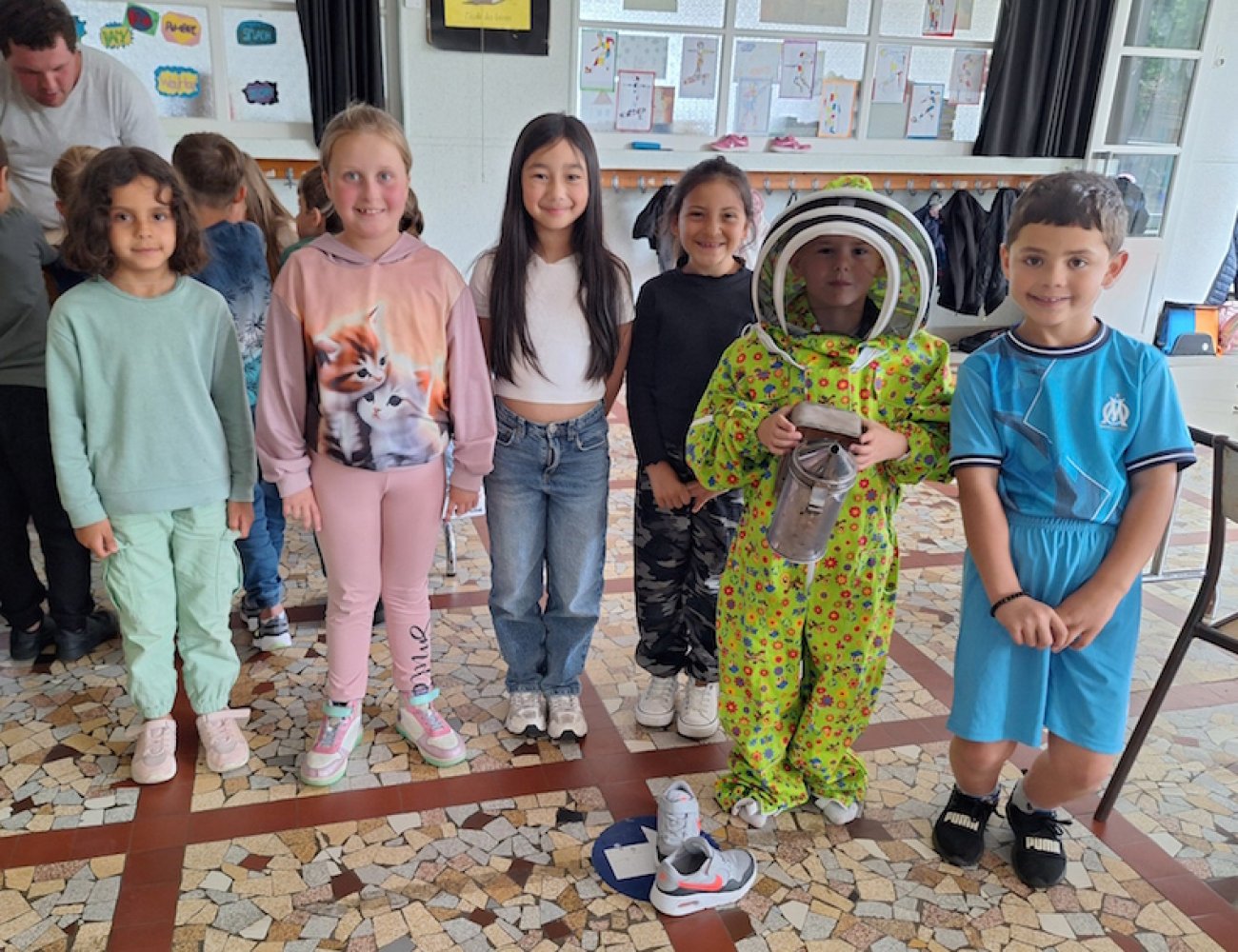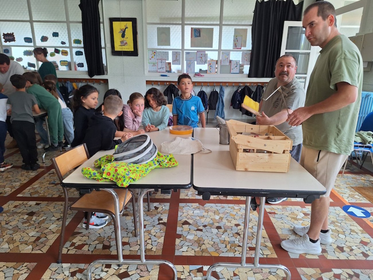 Les élèves de la casse de Christine Charleux ont écouté avec attention la riche présentation des travailleurs de l’Etablissement et Service d’Accompagnement par le Travail (ESAT) du Breuil avant de poser des dizaines de questions quelques fois surprenantes ensuite devant le matériel de l’apiculteur (vareuse, gants, pince lève cadre, enfumoir…) déployé à proximité de la classe.