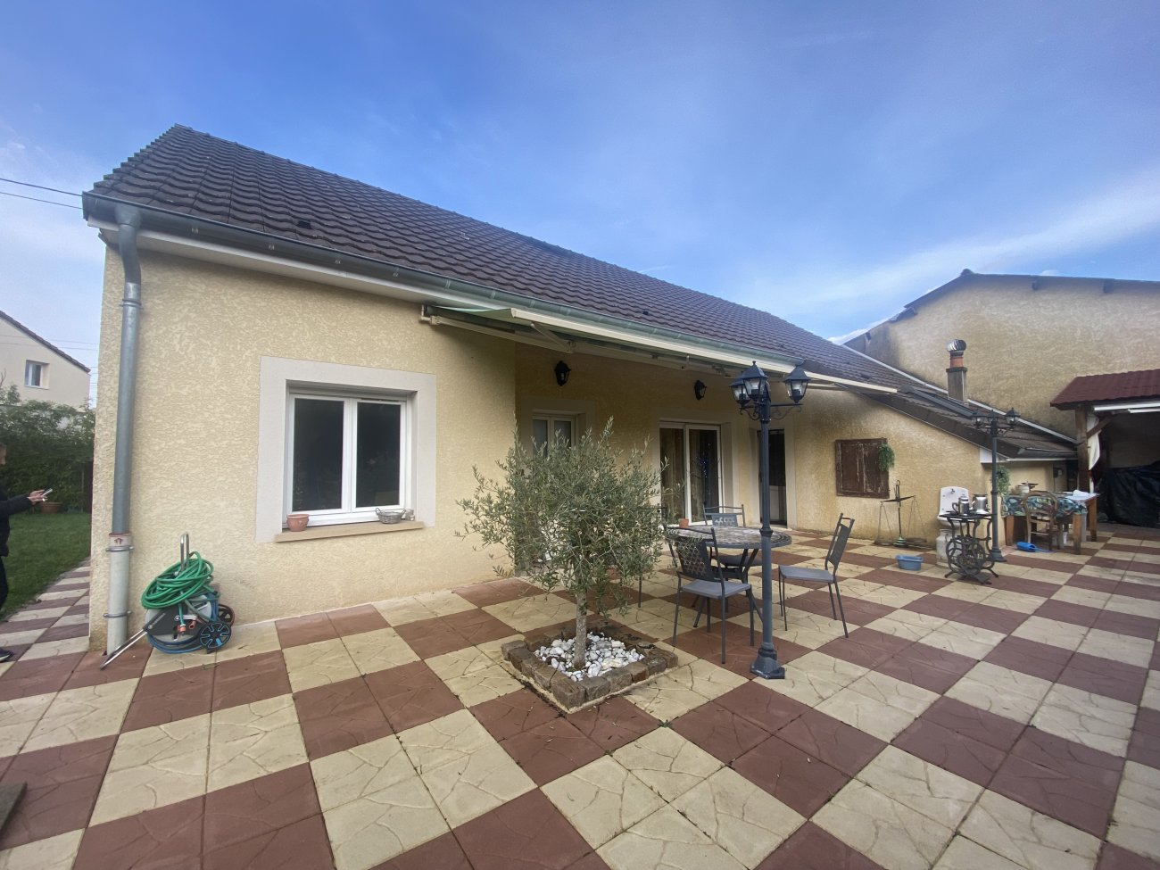 Cour, jardin, belle terrasse carrelée avec son store banne, le tout sur 436m² de terrain.