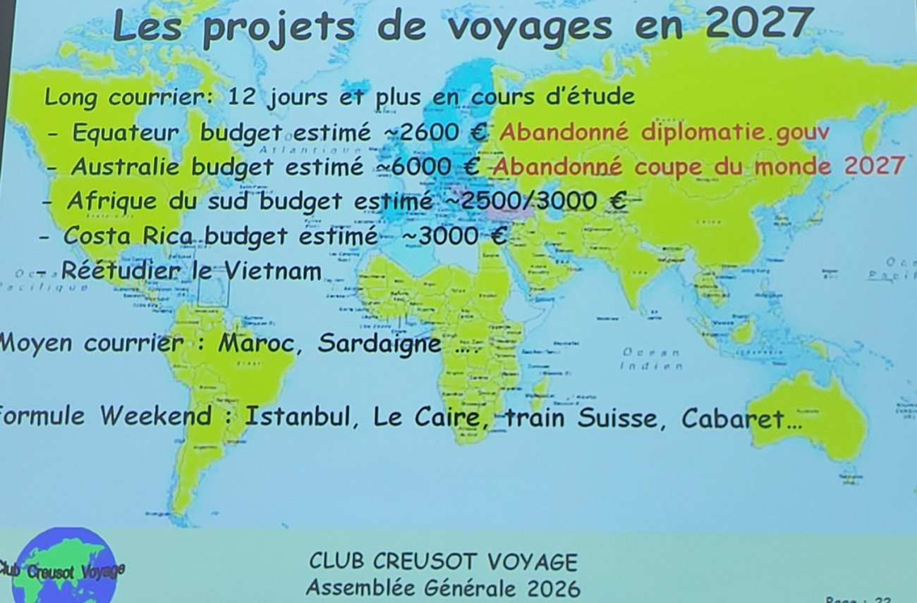 A ce sujet, je vous indiquerai au début de cette consultation, les destinations suggérées par le bureau pour chaque type de voyage qui ne restent que des possibilités sur lesquelles vous pourrez vous prononcer. Merci de votre participation active et n’hésitez pas à parler autour de vous de nos activités.