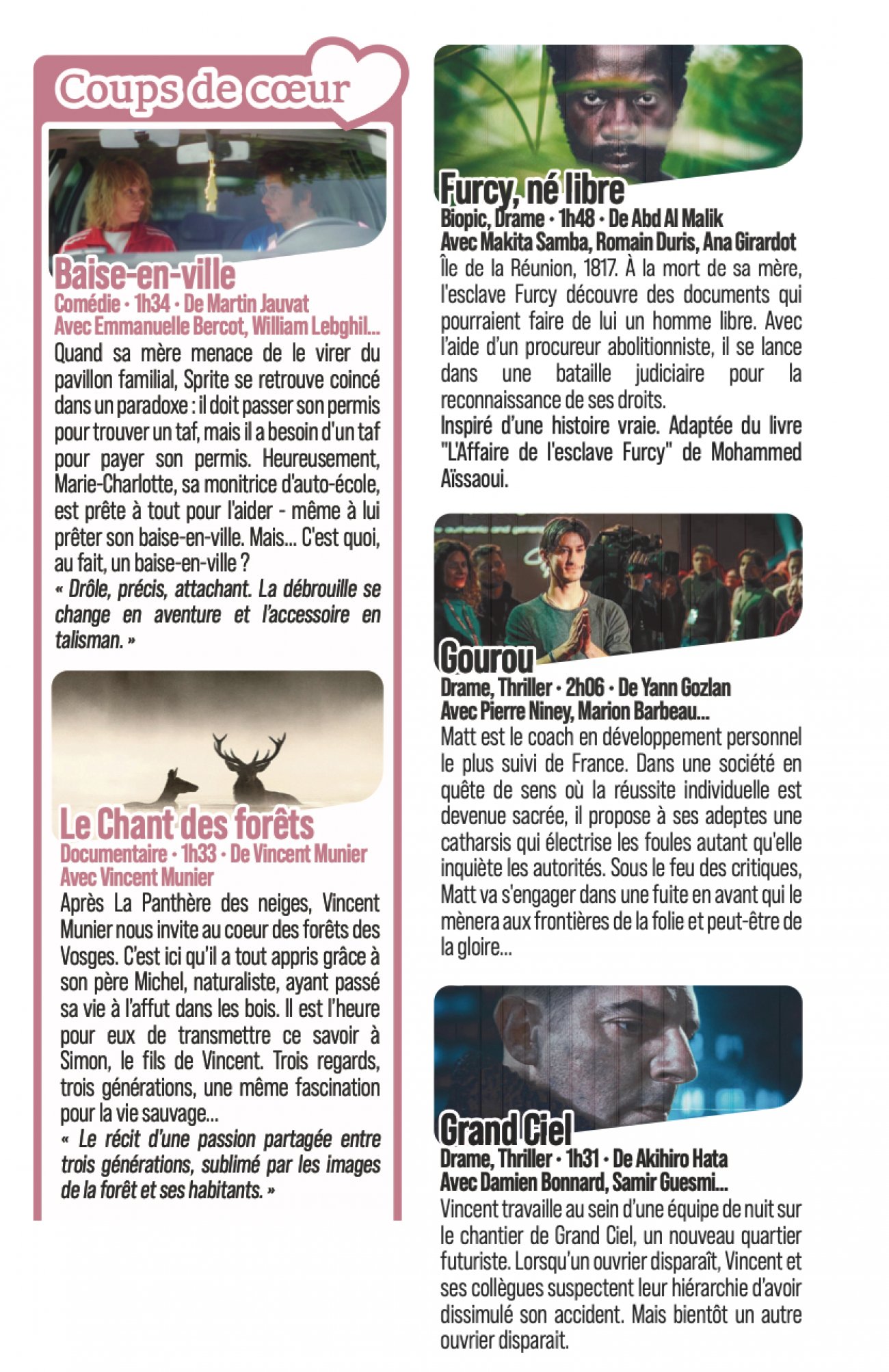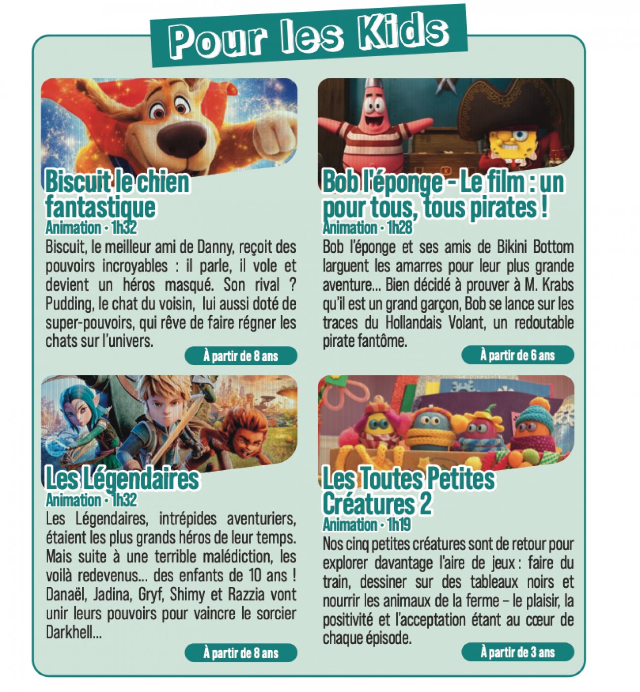Les cinéphiles pourront aussi profiter de programmations à la mi-journée, avec le dimanche 8 février toujours, Olivia à 11h40, Gourou à 12h15, Baise-en-ville à 13 heures, Bob l’éponge à 13h15…