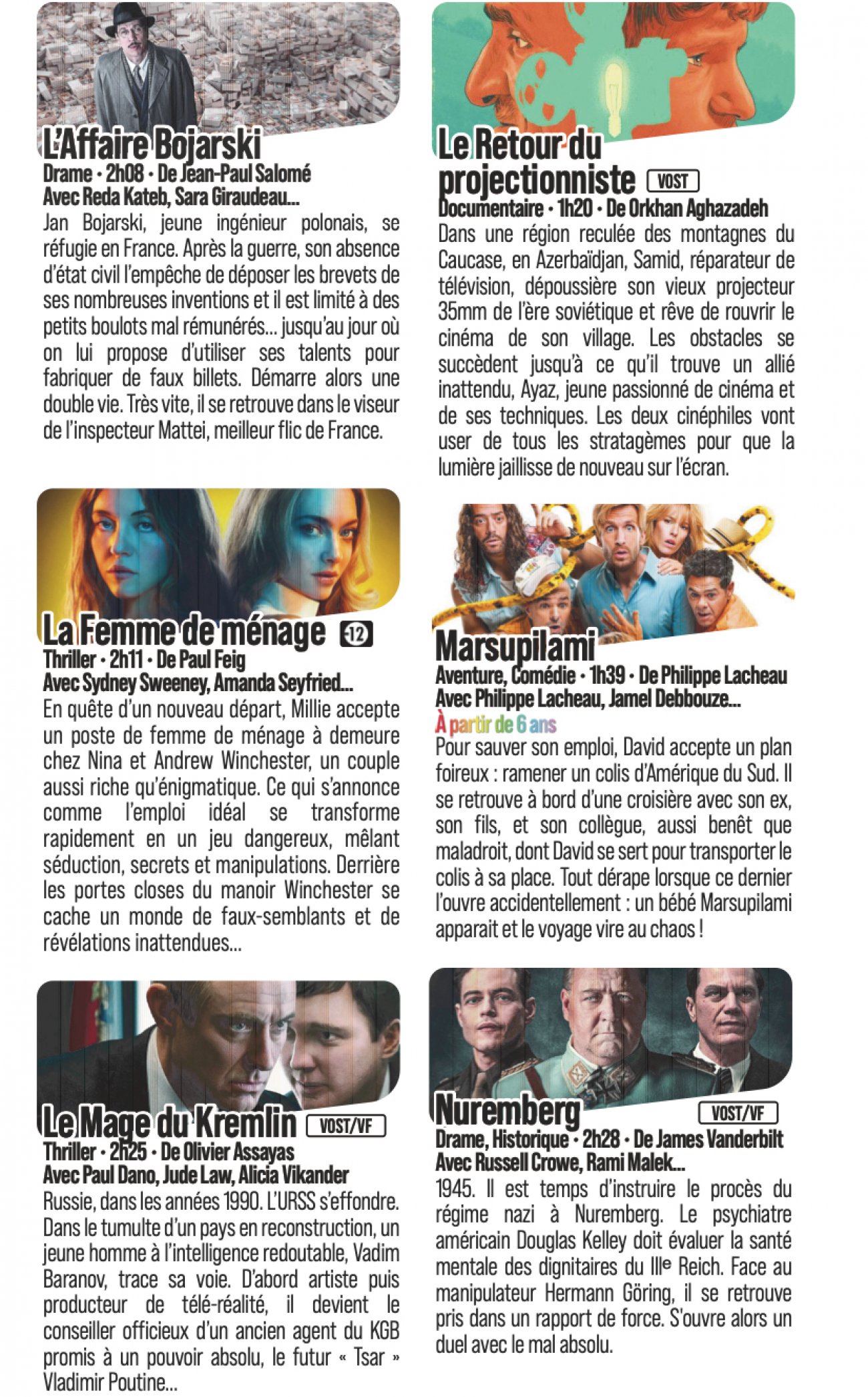 Certains films bénéficieront de nombreuses projections : 12 pour Gourou et même 15 pour Marsupilami qui sera le premier film à inaugurer les séances matinales le dimanche. Avec une programmation à 10h15 le dimanche 8 février, suivie à 10h30 de L’affaire Bojarski, puis à 10h40 Les Toutes Petites Créatures 2.