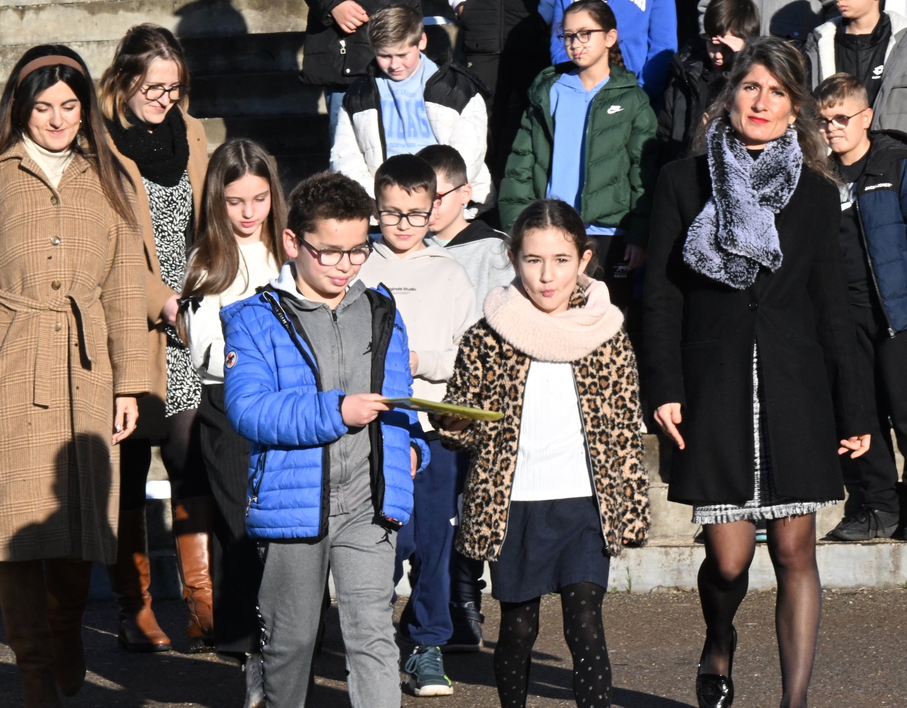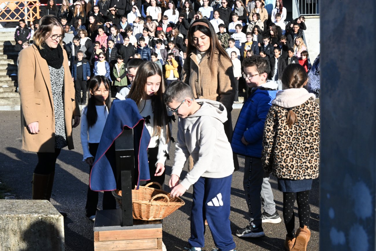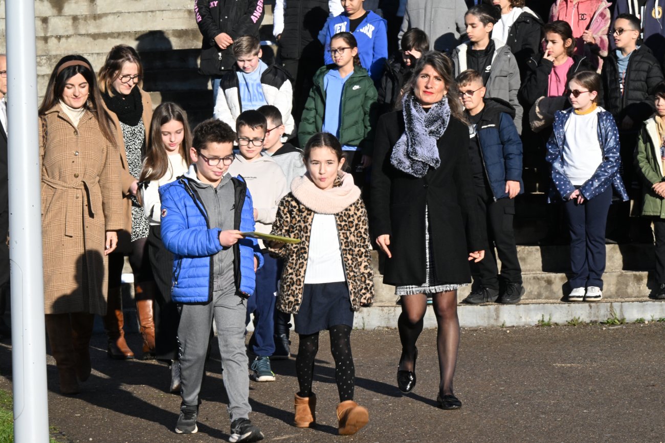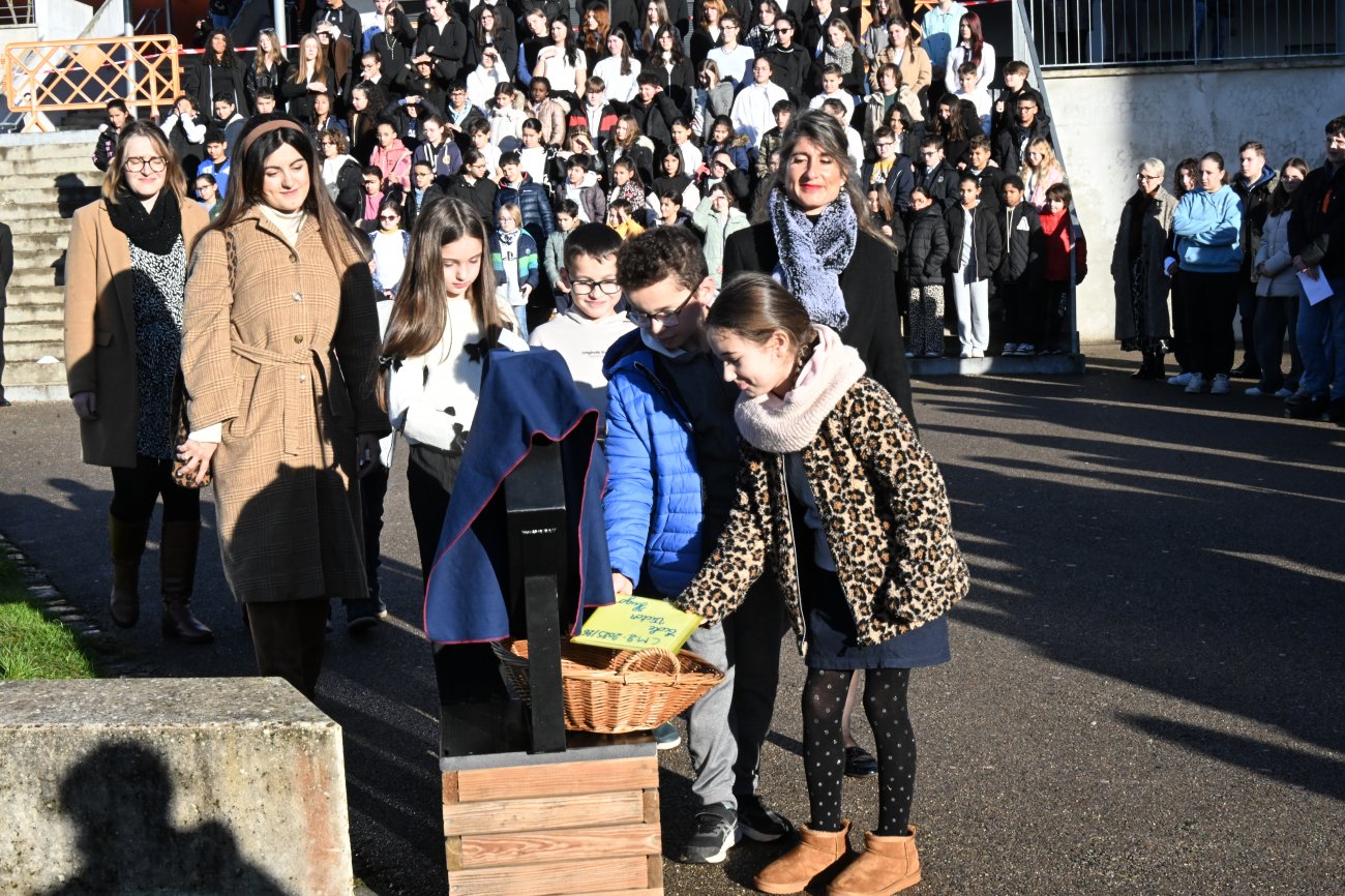 En présence aussi des élèves de CM1 et CM2 de l’école Victor Hugo qui, en fin de cérémonie, ont interprété une version longue de la Marseillaise. Des élèves qui en début de cérémonie avaient déposé des messages qui seront lus, à la fin de leur Terminale en 2032.