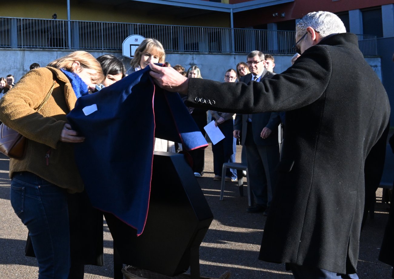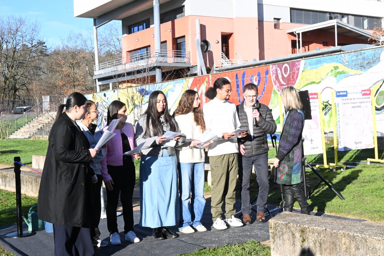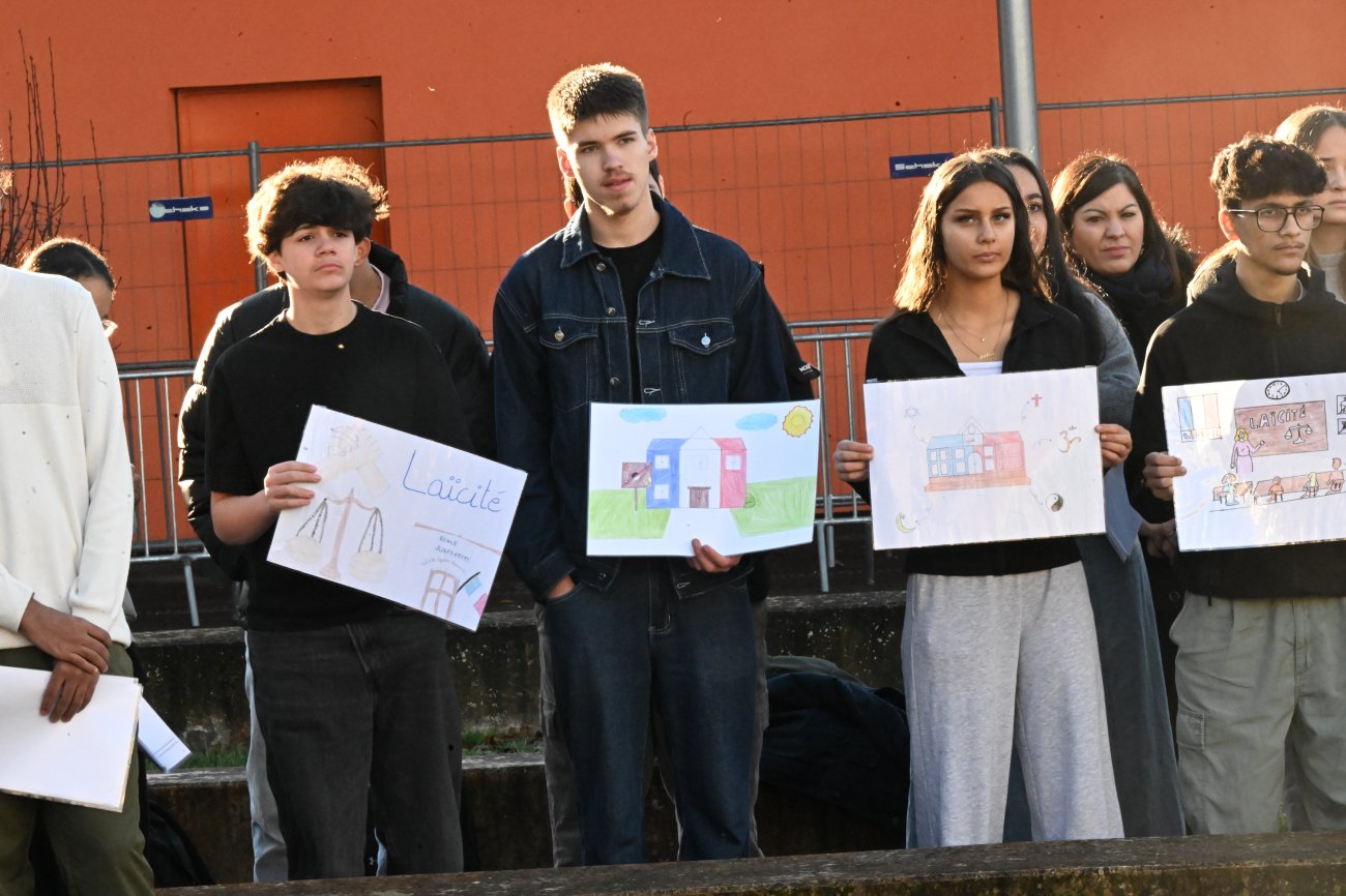 «Cette cérémonie ce sont d'abord les jeunes élèves de l'école Victor Hugo, Victor Hugo, un nom incontournable quand on parle de laïcité, Victor Hugo, l'un des grands penseurs de la laïcité. Ce sont aussi les élèves des classes de seconde professionnelles et générales du lycée Léon Blum mobilisées sur ce projet ; Les élèves de la classe de 3ème Prépa Métiers ; Ce sont également les jeunes des classes de plusieurs sections professionnelles industrielles et tertiaires : mode, chaudronnerie ; Ce sont enfin des étudiants de BTS.