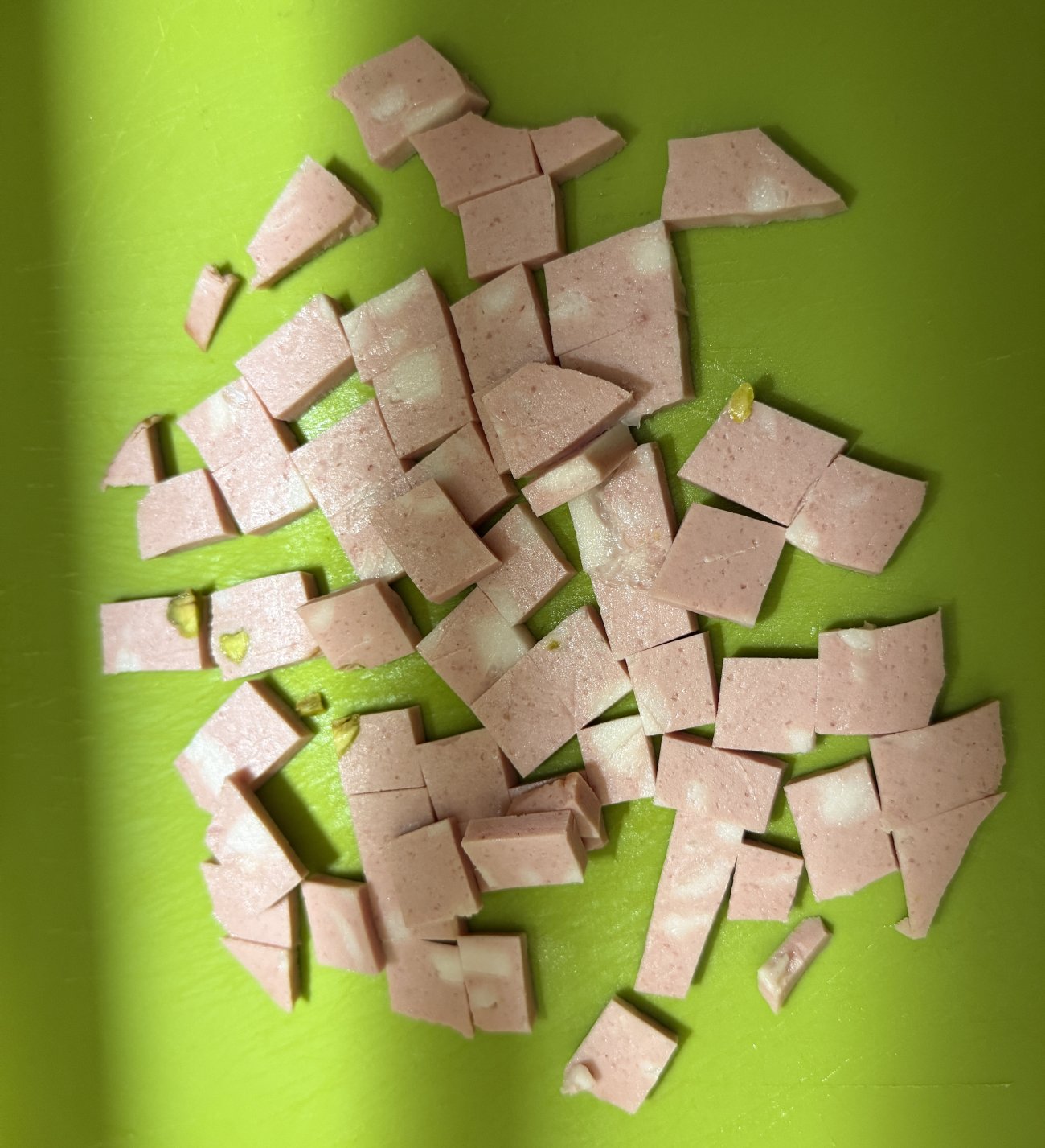 Pendant ce temps là vous mettez votre sauce tomate à chauffer dans votre petite casserole avec un peu d’huile d’olive et vous coupez votre mortadelle en petits cubes.