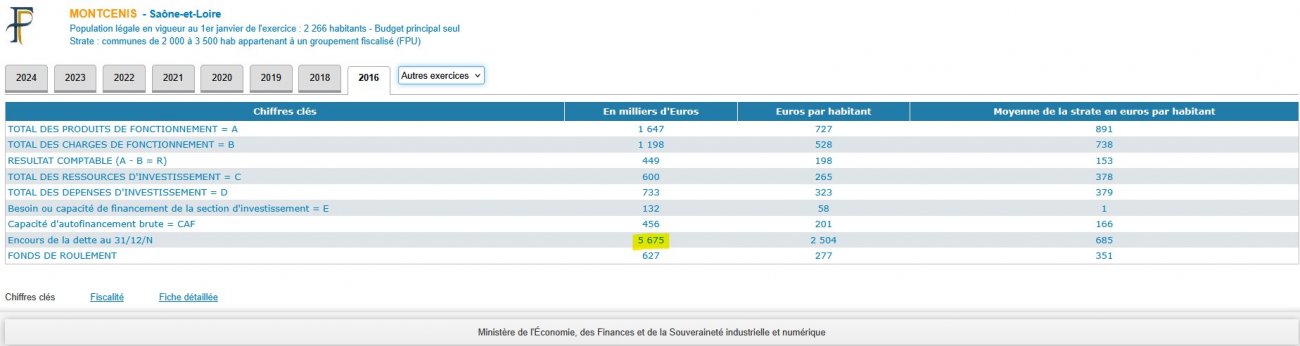 1) M. le maire affirme avoir réduit la dette de 7,5 à 3,5 millions € lors de son long mandat (2016-2026). Premier problème : le chiffre de départ avancé est tout bonnement... faux ! Fin 2016, selon le Ministère de l’Économie et des Finances, l’encours réel des crédits de la commune était de 5,675 millions €. Si la dette de la commune a effectivement baissé sur la période (son estimation, fin 2025, est de 3,4 millions €), le montant réel du désendettement est pratiquement... deux fois moins important que celui annoncé par T. Buisson ! Gonfler le chiffre de départ permet assurément à ce dernier de présenter un bilan bien plus flatteur que la réalité...