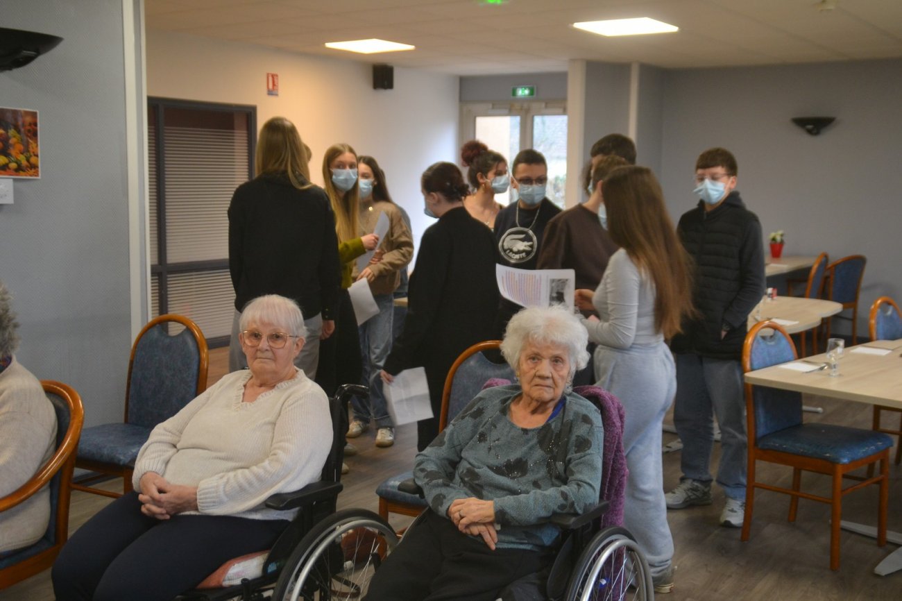 Il y a trois semaines, ils étaient venus une première fois à la rencontre de résidents volontaires pour collecter différentes témoignages au sujet des écrans, télévision ou cinéma. Ce jeudi donc et après tout un travail d’écriture en classe, ils se sont retrouvés par groupe de deux ou trois pour lire leur production.