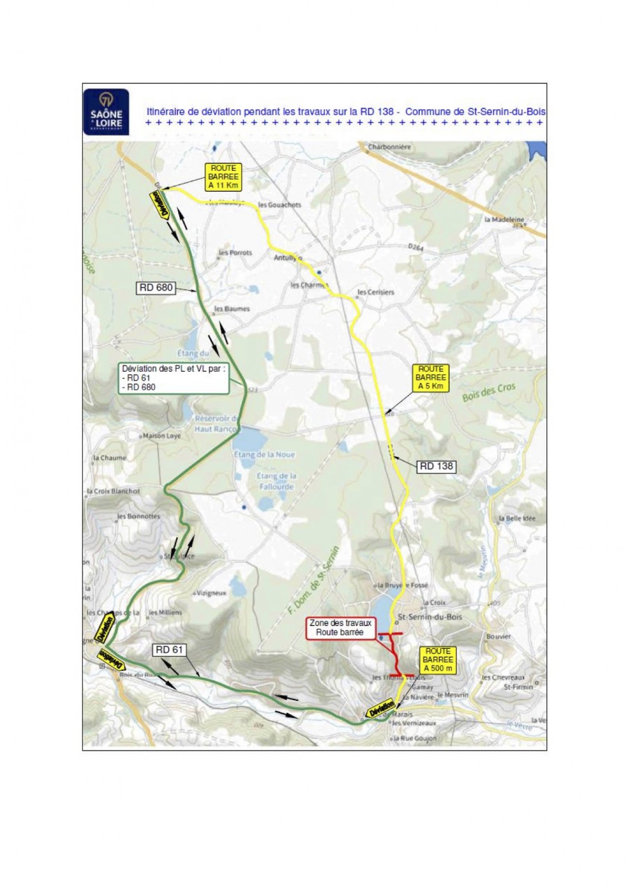 ACTUALISÉ : La DRI (direction des routes et infrastructures) signale que le chantier qui devait débuter ce lundi 7 juillet à Saint-Sernin-du-Bois est repoussé a minima de deux semaines. Enedis n’ayant pas terminé les travaux préparatoires. La circulation reste en mode alterné.