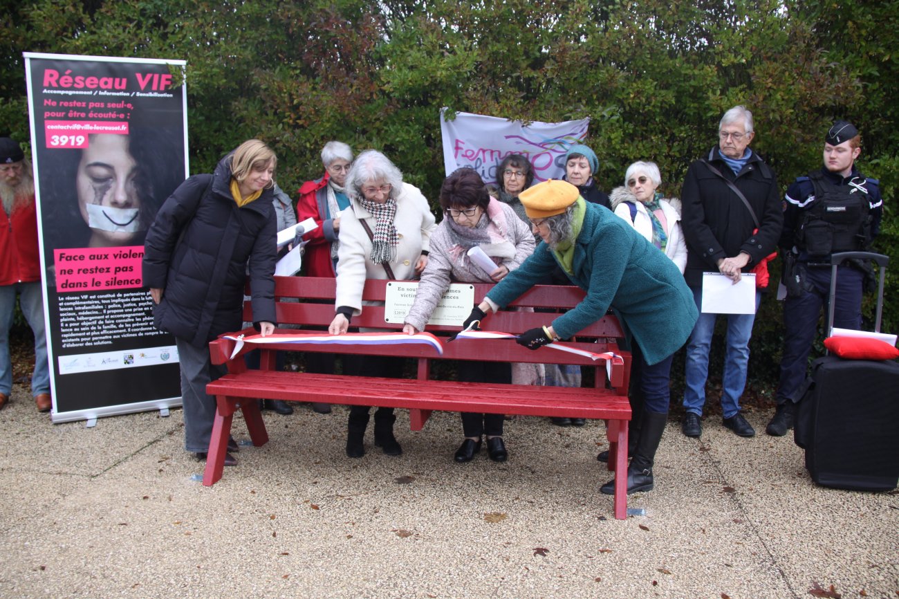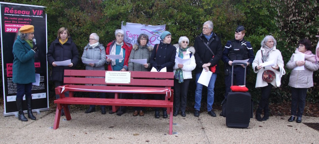 Cette dernière devait rappeler que ce banc de couleur sang est symbolique : « Il met en lumière une actualité inacceptable, intolérable à savoir les Féminicides, les violences sexuelles et sexistes que subissent les femmes parce qu’elles sont femmes!. Ce banc est le symbole de l’indicible, de ce qui ne devrait pas être, l’assassinat de femmes, de filles par leur compagnon, conjoint ou ex… Ce banc concrétise la lutte contre l’injustice, concrétise un engagement fort contre ces violences, contre ces meurtres… Toutes ses violences sont punies par la loi, mais cela doit être appliqué rigoureusement. Il est impératif de prendre au sérieux tout signalement de violences…».