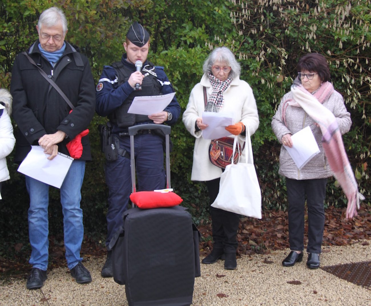 Elle a porté l’action, conseillère déléguée au cadre de vie, Martine Boyer devait lire ensuite un magnifique poème de Daniel Meunier : « Sous les bleus de son silence, elle avait l’habitude de parler doucement…La tristesse de son regard au silence creux n’arrivait pas parfois à ne plus ranger ses larmes…elle attendait en secret ce jour espéré où cesseraient enfin ces destructrices tempêtes, faites d’humiliations, violences, indignités. Pour déplier son âme et relever la tête…». Plusieurs élus et représentants ou responsables d’associations locales étaient présents samedi. Philippe Pigeau maire de Torcy assistait à la cérémonie et la commune de Saint-Firmin était représentée par Magali Douheret première adjointe. Nous avons salué également Jean-Marc Hippolyte conseiller départemental et Laëtitia Martinez vice-présidente de région. La présence de plusieurs gendarmes dont l’adjudant-chef Pinto de la communauté de brigade de Montchanin et du Creusot a été remarquée dans l’assistance.