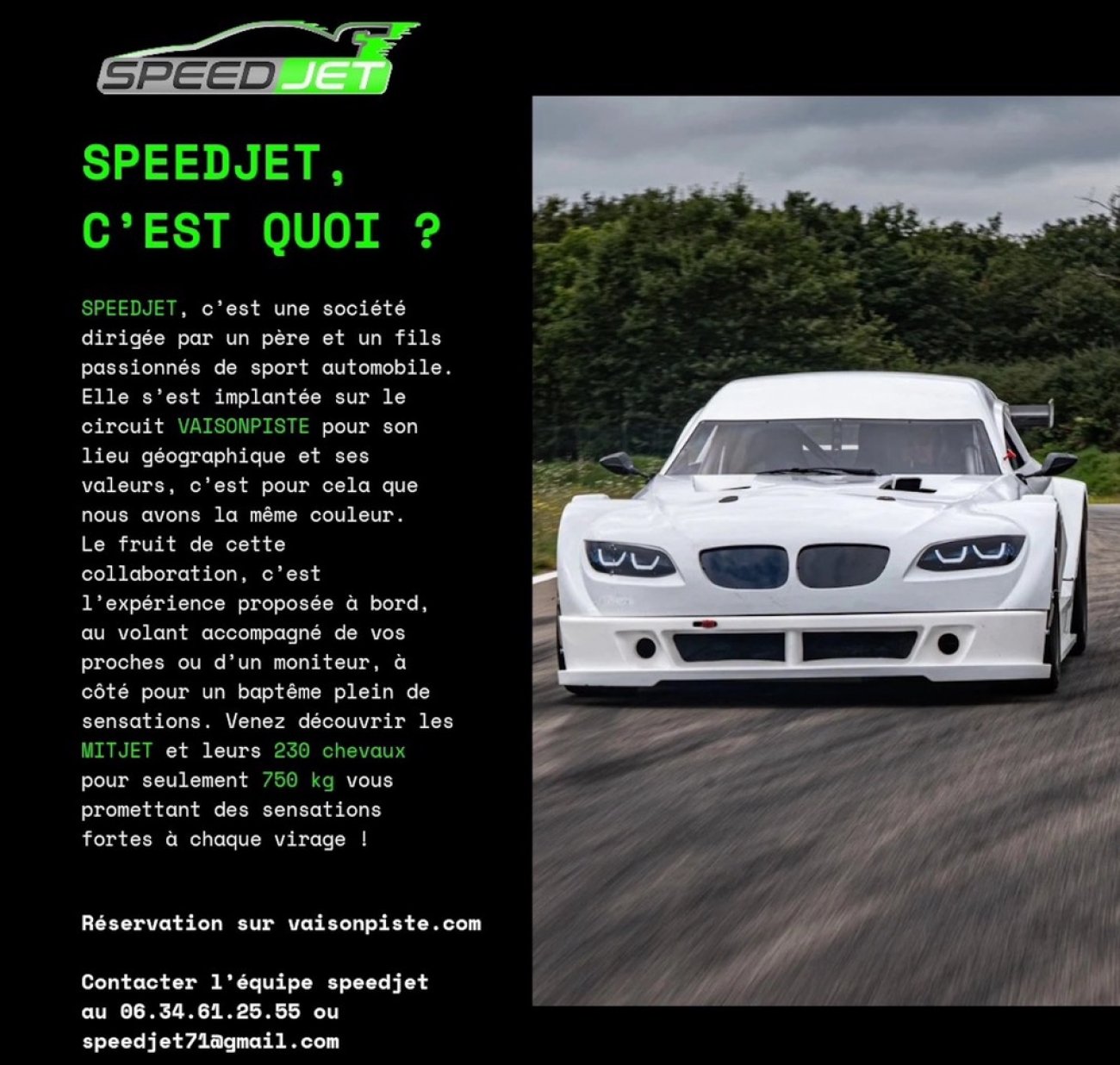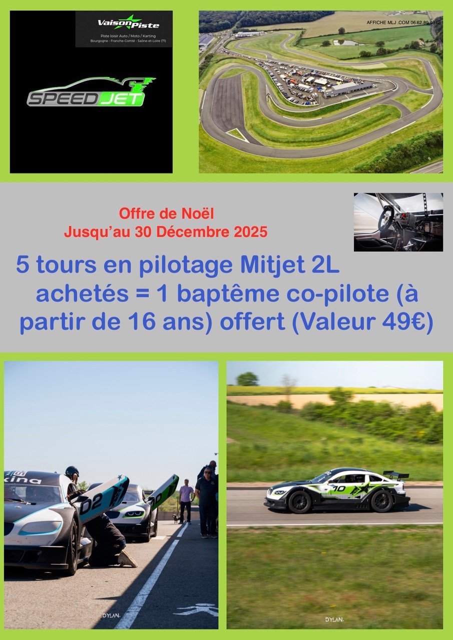 A 1 heure à peine des principales villes Bourguignonnes, sur le circuit sinueux et vallonné « Vaison Piste », homologué par la FFSA et la FFM, venez piloter avec « Speedjet 71 » des Mijet 2L ou réaliser un baptême co-pilote (à partir de 16 ans)